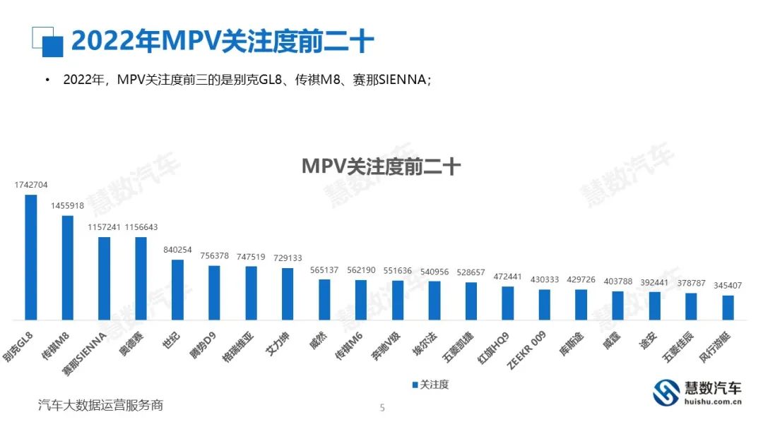2022年,MPV关注度排行榜前三的车系是别克GL8、传祺M8、赛那SIENNA;