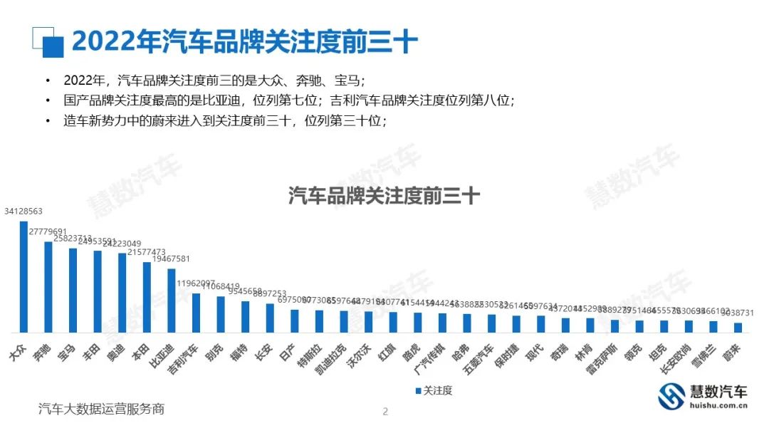 2022年,汽车品牌关注度排行榜前三的是大众、奔驰、宝马;
