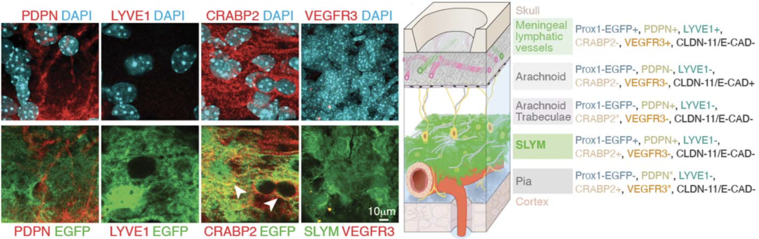 接下来,Møllgård团队对SLYM的免疫表型进行了表征,发现SLYM中另一个淋巴管标志PDPN表达呈阳性,而淋巴管内皮细胞受体1(LYVE1)表达呈阴性。此外,SLYM中细胞维甲酸结合蛋白2(CRABP2)表达呈阳性。与SLYM不同,硬脑膜上的淋巴管表达所有的经典淋巴标志物(Prox1-EGFP+、PDPN+、LYVE1+和VEGFR3+,但CRABP2–)。