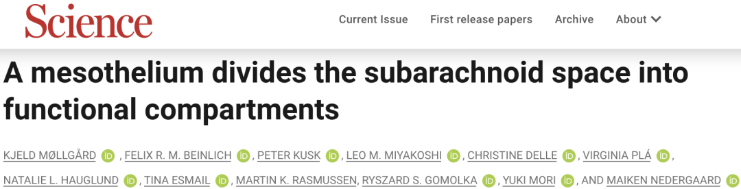 1.Mollgard K, Beinlich FRM, Kusk P, Miyakoshi LM, Delle C, Pla V, Hauglund NL, Esmail T, Rasmussen MK, Gomolka RS et al: A mesothelium divides the subarachnoid space into functional compartments. Science 2023, 379(6627):84-88.