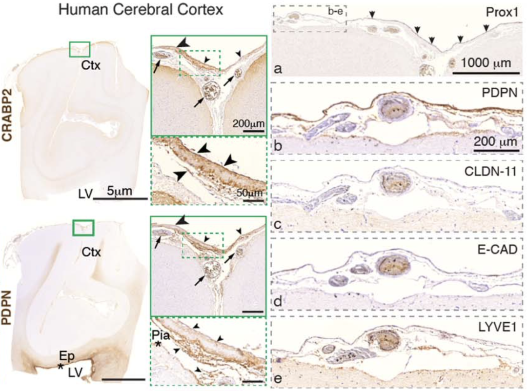 值得注意的是,对成人大脑皮质的分析表明,在软脑膜上方的蛛网膜下腔同样存在CRABP2+/PDPN+的膜结构。因此,SLYM在人类的大脑中同样存在。