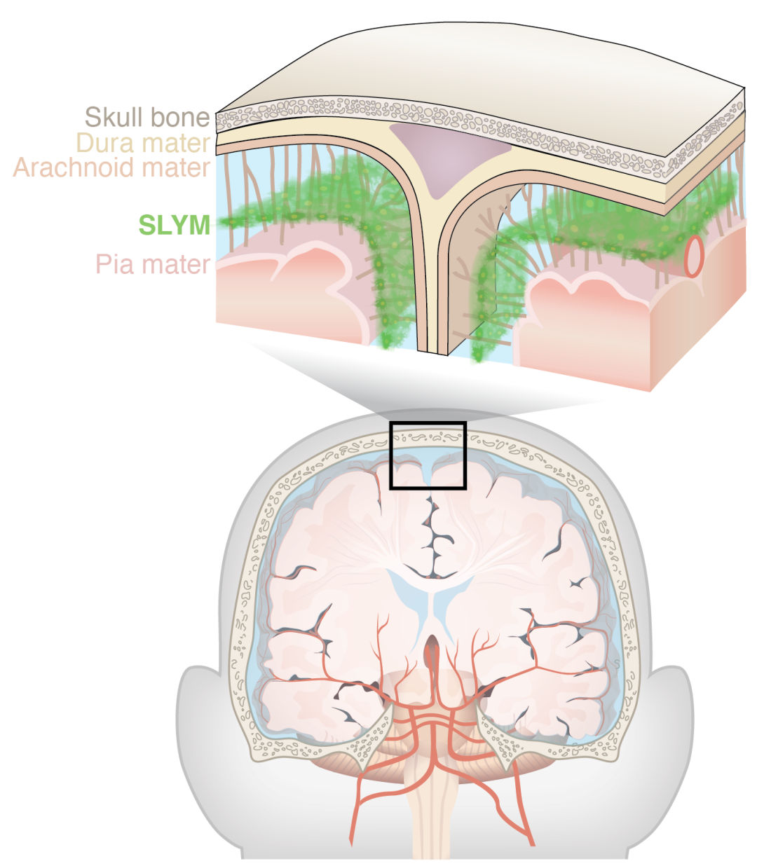 SLYM位于蛛网膜与软脑膜之间,将蛛网膜下腔分为浅层和深层,并包裹着蛛网膜下腔内的血管,其形态和免疫表型类似于外周器官表面的间皮层。在功能上,SLYM不仅可起到润滑作用,在运动过程中减少大脑和头骨之间的摩擦,还可分隔并控制脑脊液在大脑表面的流动和物质的交换。