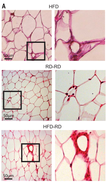 在肥胖小鼠中,巨噬细胞会聚集在死亡的脂肪细胞周围,形成一个冠状的巨噬细胞合胞体,而这种现象在瘦身小鼠中仍然存在。而且瘦身小鼠中,促炎ATM的数量也增加了3倍。