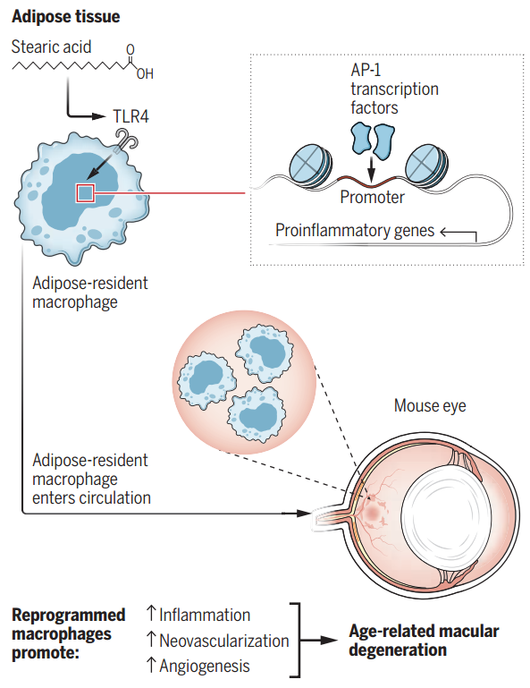 简单来说,在肥胖状态下,脂肪组织中高水平的硬脂酸会通过toll样受体(TLR4)作用,使染色质展开,招募激活蛋白-1(AP-1)转录因子,导致巨噬细胞的表观遗传改变。这些细胞呈现促炎表型,更多表达肿瘤坏死因子(TNF)、白介素1-β、白介素6等促炎细胞因子。当它们进入眼部,就会促进病理性炎症并加快AMD进展。