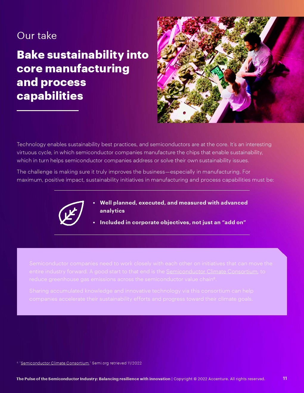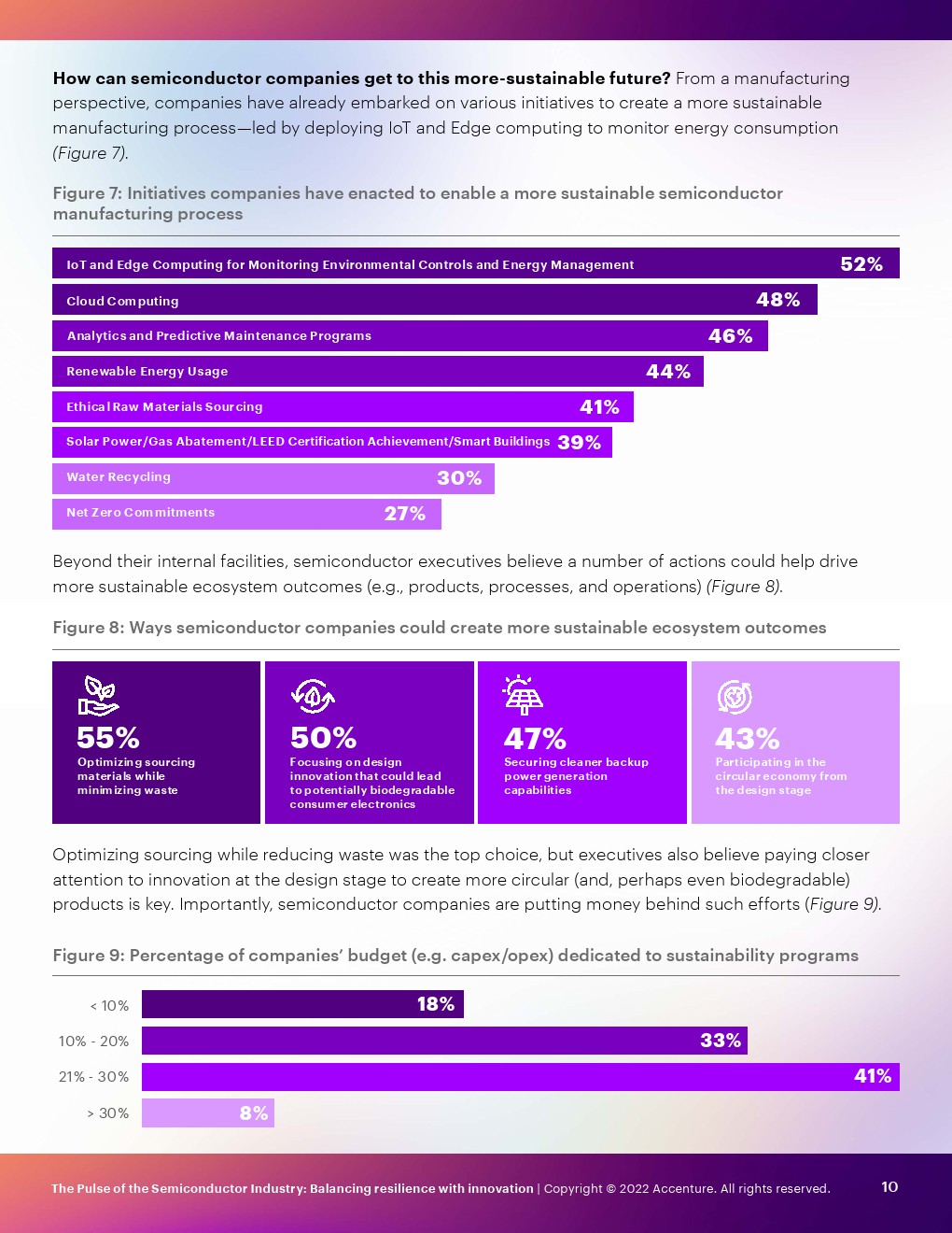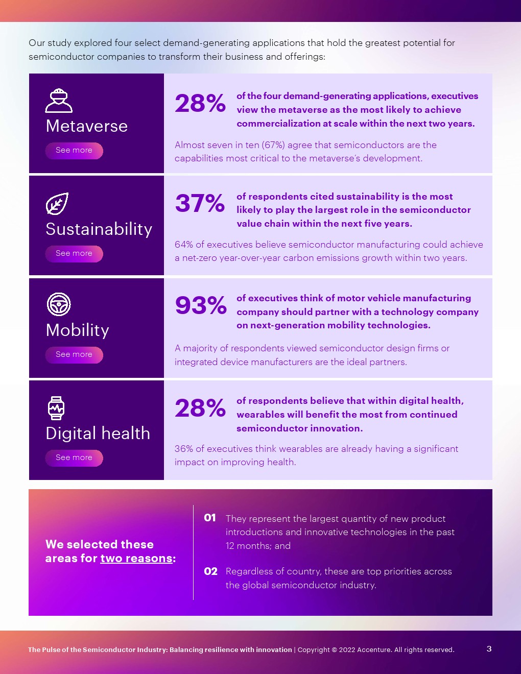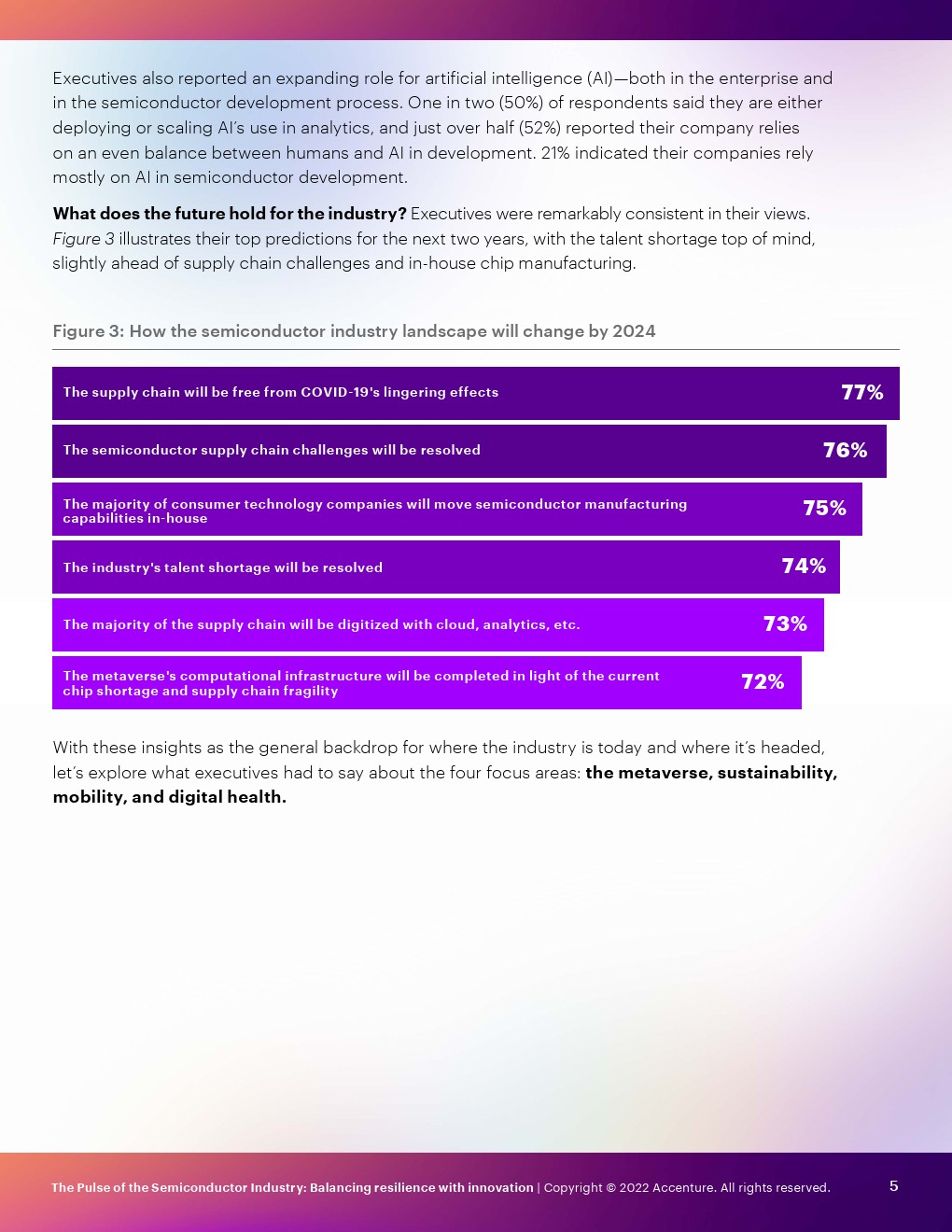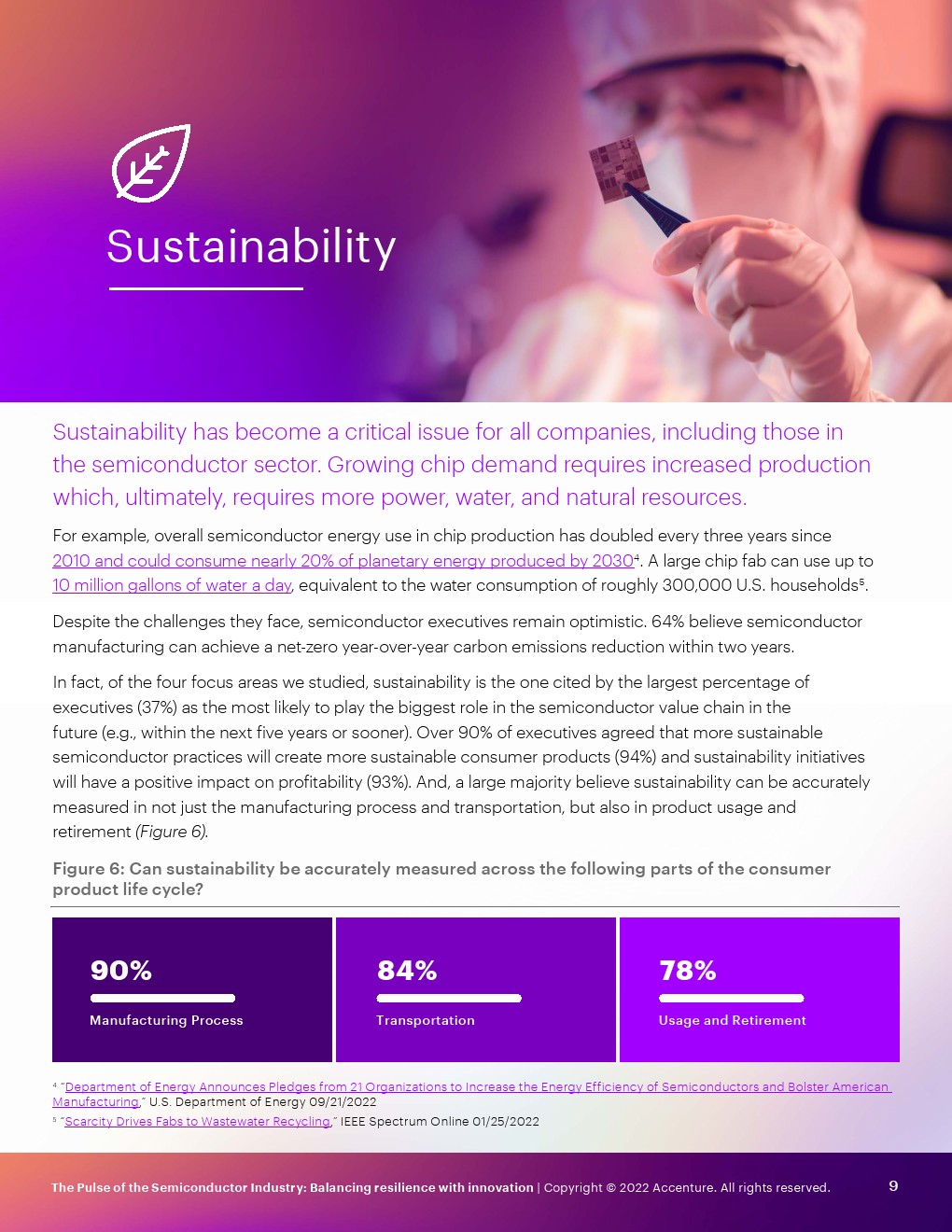 可持续性——93%的高管认为可持续性举措对盈利能力产生积极影响,并创造更具可持续性的消费品。可持续性也被认为是未来五年内最有可能在半导体价值链中发挥最大作用的领域。