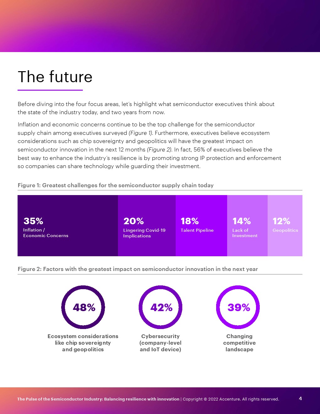 高管们列举了可能影响他们创新能力的挑战,即使大流行对供应链的挥之不去的影响也在提升。其他最常见的挑战是地缘政治(48%的受访者提到)、网络安全威胁(42%)、不断变化的竞争格局(39%) 和人才短缺(35%) 等。面对不断变化的行业格局,65%的高管相信摩尔定律的速度到 2024 年将放缓。 此外,56% 的受访者认为,促进强有力的知识产权保护和执法是增强该行业向前发展的弹性的最佳方式之一。