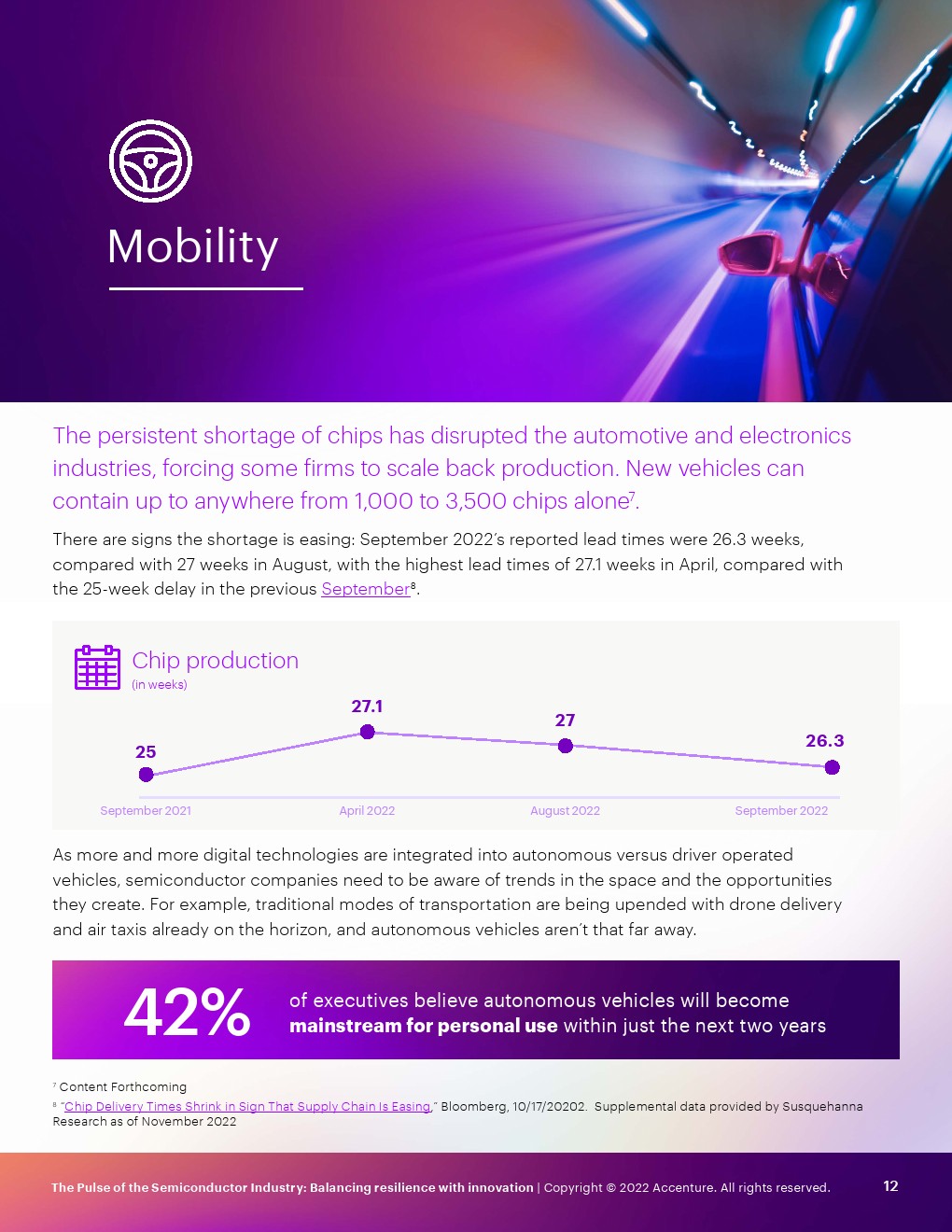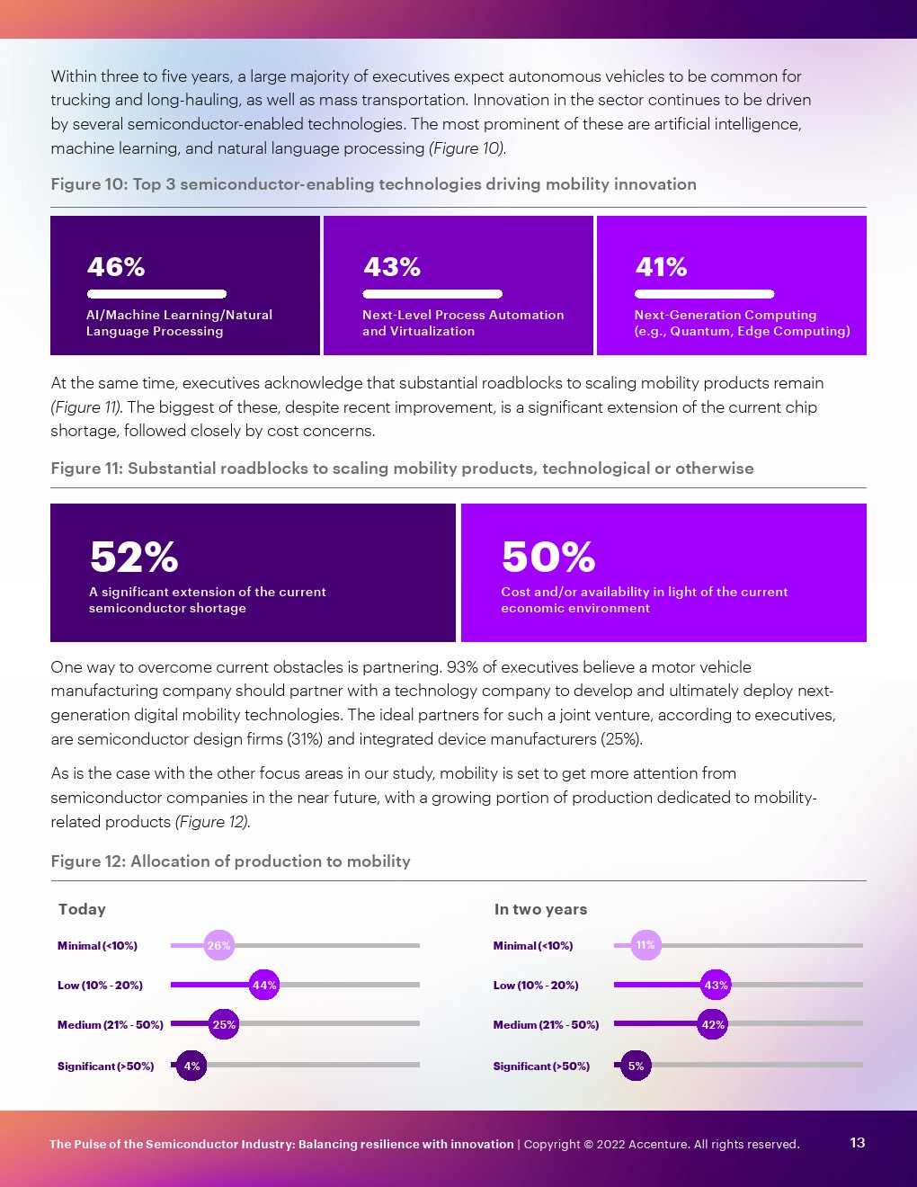 移动性——长期的芯片短缺和成本问题被认为是未来移动性的最大障碍,导致 93% 的高管认为汽车制造商应该与半导体和技术企业合作开发下一代移动技术。