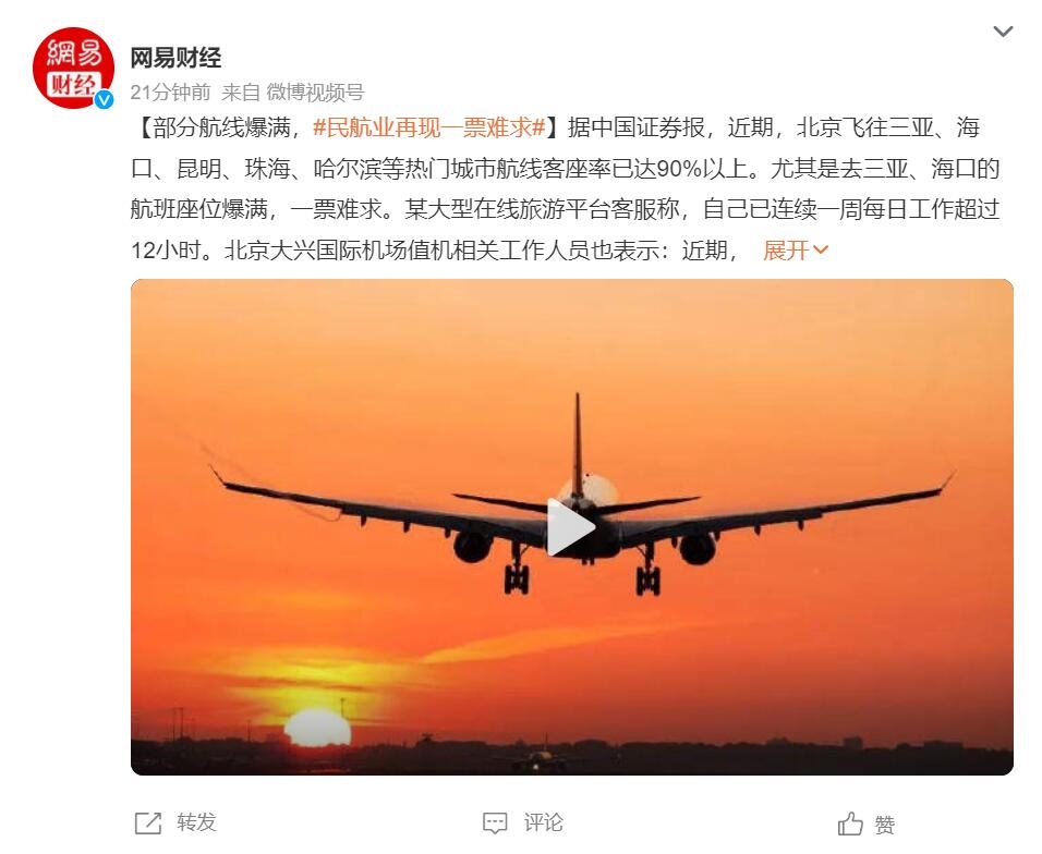 近日消息,据多维财经报道,近期北京飞往三亚、海口、昆明、珠海、哈尔滨等热门城市航线客座率已达90%以上。尤其是去三亚、海口的航班座位爆满,一票难求。
