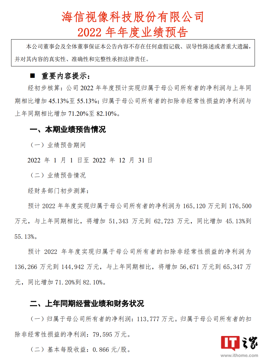 海信视像预计 2022 年年度实现归属于母公司所有者的扣除非经常性损益的净利润为 13.63 亿元到 14.49 亿元,与上年同期相比,将增加 5.67 亿元到 6.53 亿元,同比增加 71.20% 到 82.10%。