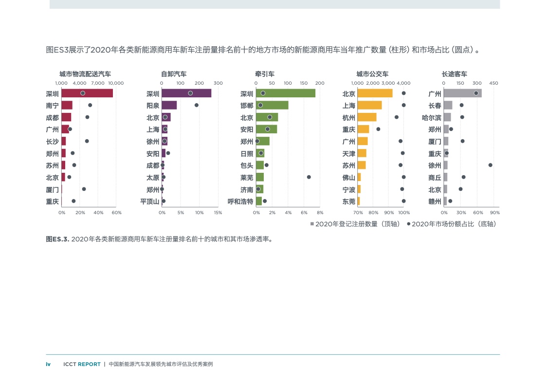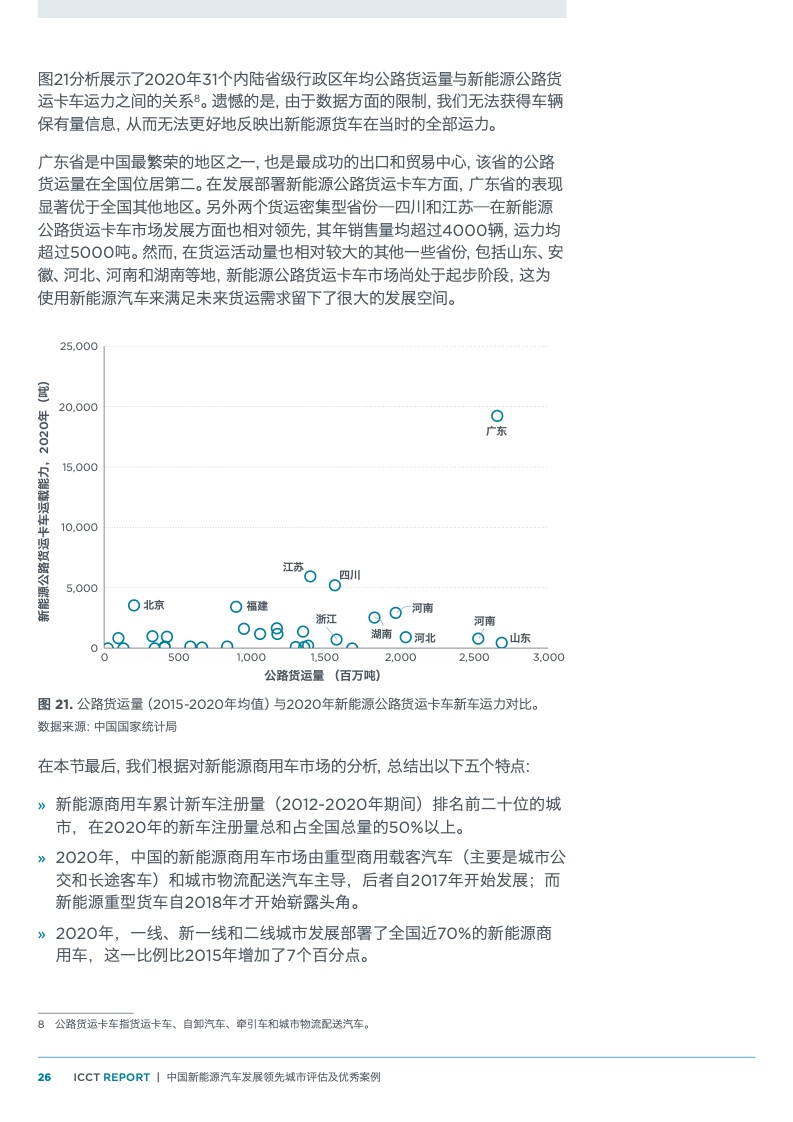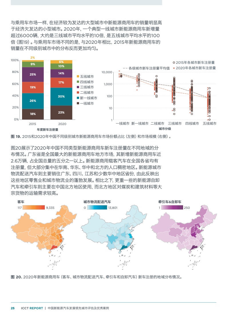 对于乘用车市场,本文还在城市级别层面进行新能源汽车领先市场的分析,旨在发掘大、中、小型城市,发达和欠发达城市中新能源乘用车发展的佼佼者。城市级别的划分参考了主流财经网站2020年对一线、新一线、二、三、四、五线城市的划分。对于商用车市场,本文根据商用车细分类别,包括城市物流配送汽车、自卸汽车、牵引车、城市公交和长途客车,来分别评估分析领军市场。这样的细分市场分析可以更精准地为不同使用场景的商用车电动化提供支撑。