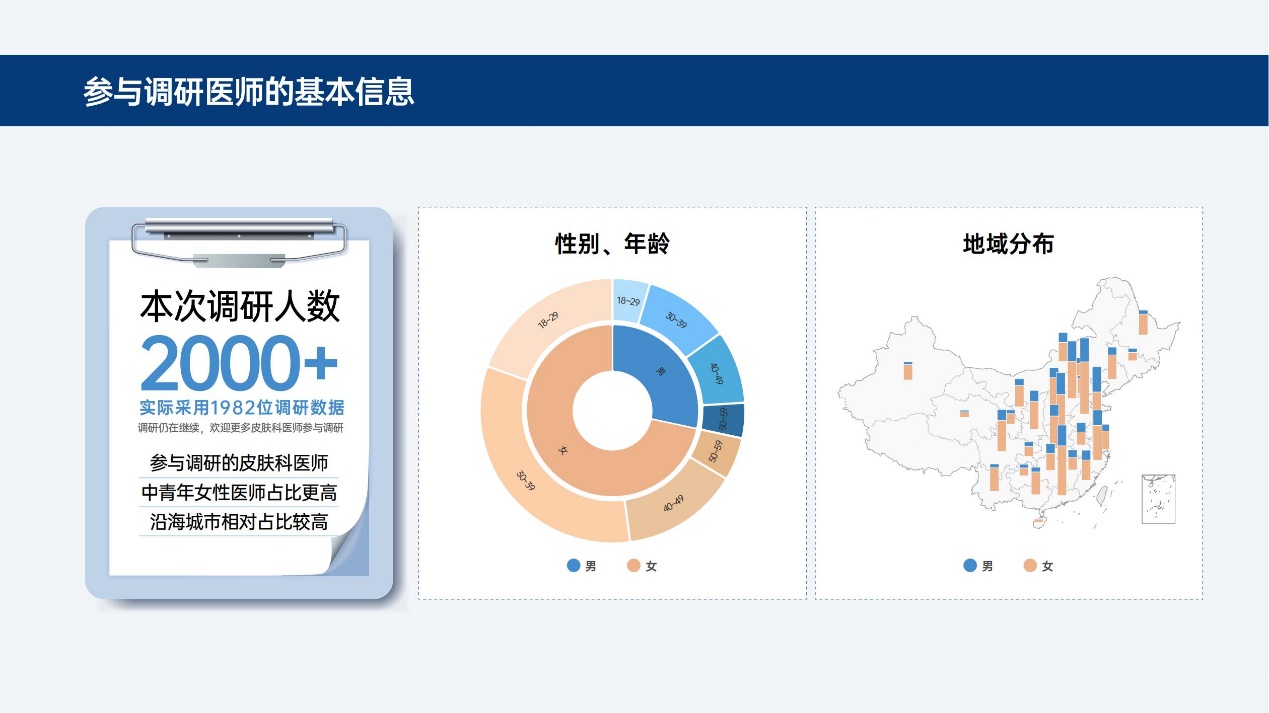 据悉,此次报告触达地域远及新疆、甘肃、云南、黑龙江等省市,28 天中,参与调研人数超 2000 位。参与调研的医师群体年龄范围均在 18 岁至 59 岁之间,并被进一步细分为 18-29 岁、30-39 岁、40-49 岁和 50-59 岁,以便通过不同年龄段、不同性别的医师反馈,对功效性护肤品的临床应用进行精细观察。参与调研的皮肤科医师中,中青年女性医师和沿海城市医师占比更高。