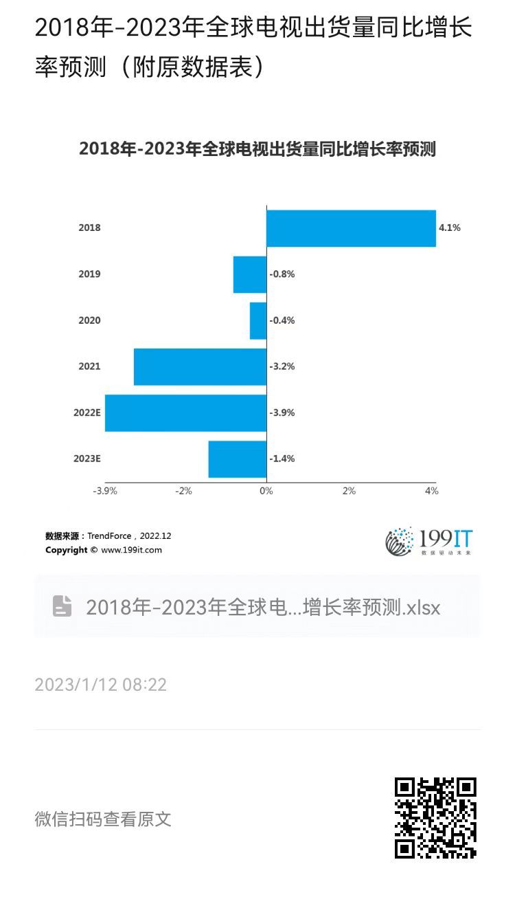 - TrendForce:2022年全球电视出货量仅2.02亿台 年减3.9%