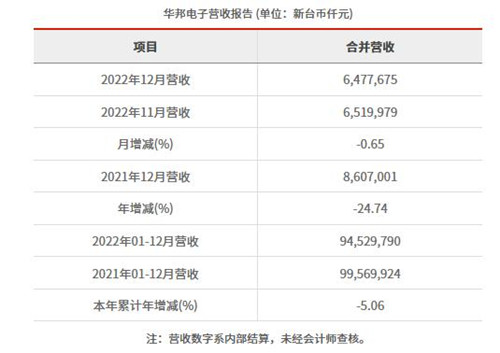 近日消息,华邦电子股份有限公司近日公布自行结算的2022年12月份营收报告。华邦含新唐科技等子公司,12月份合并营收为新台币64.78亿元,较上个月减少0.65%,较去年同期减少24.74%。累计2022年1至12月合并营收为新台币945.30亿元,较去年同期减少5.06%。