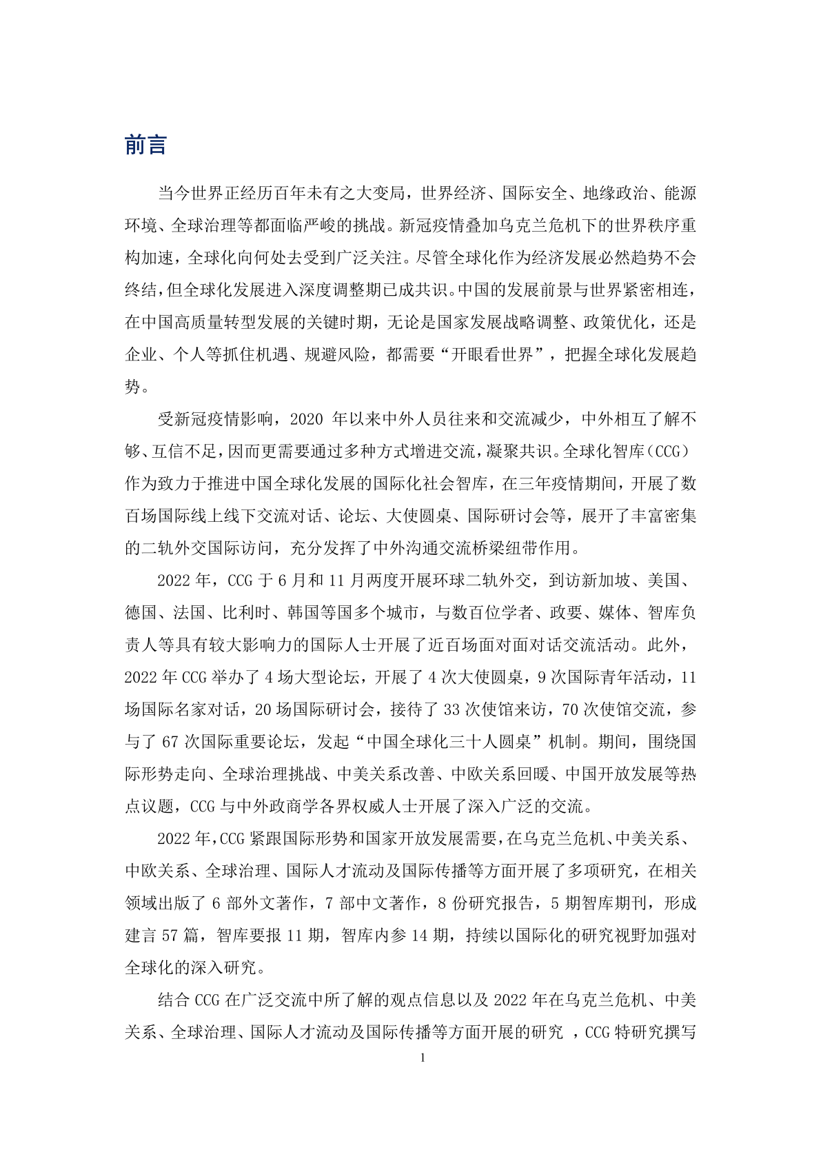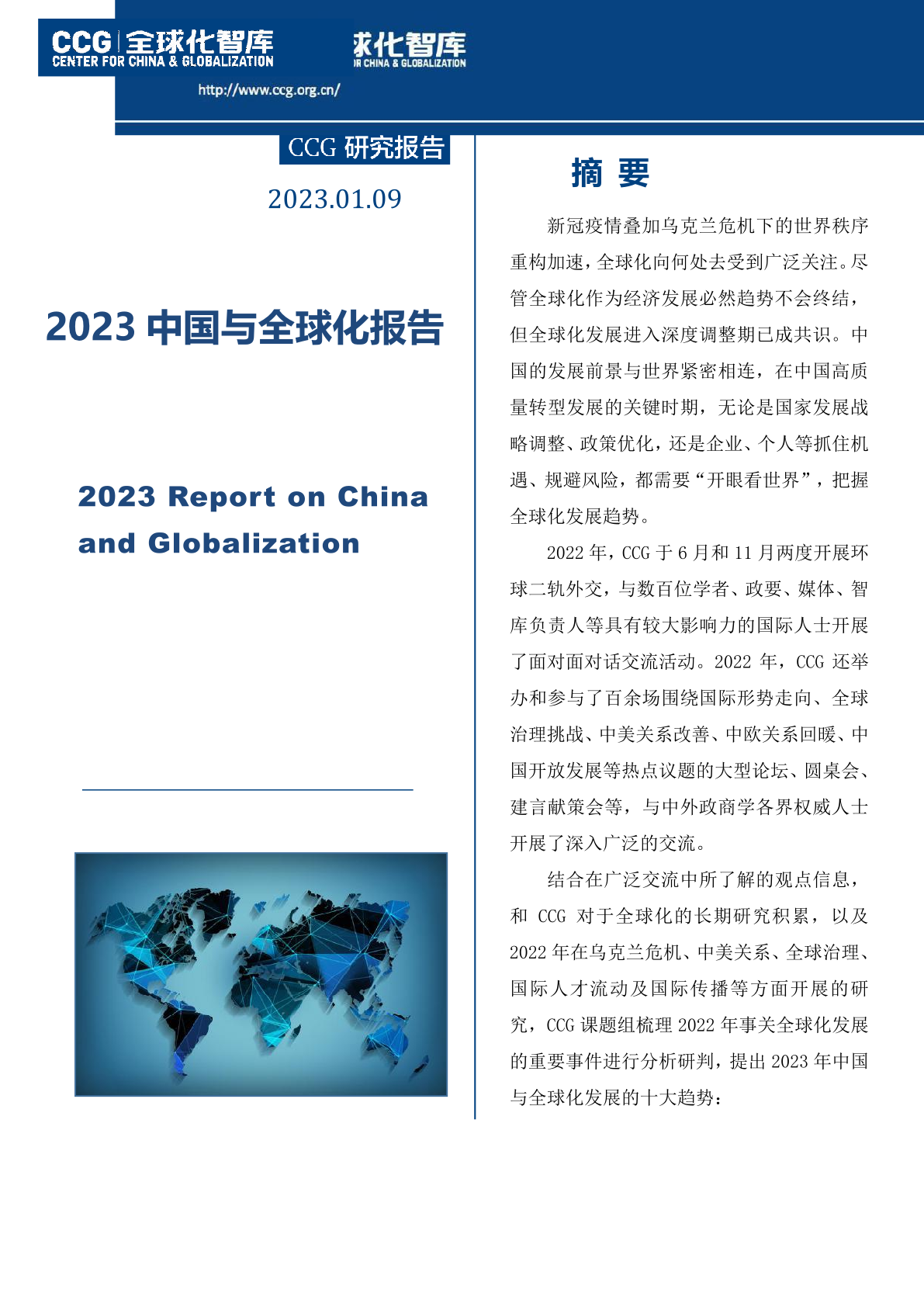 结合在广泛交流中所了解的观点信息,和CCG对于全球化的长期研究积累,以及2022年在乌克兰危机、中美关系、全球治理、国际人才流动及国际传播等方面开展的研究,CCG课题组梳理2022年事关全球化发展的重要事件进行分析研判,提出2023年中国与全球化发展的十大趋势: