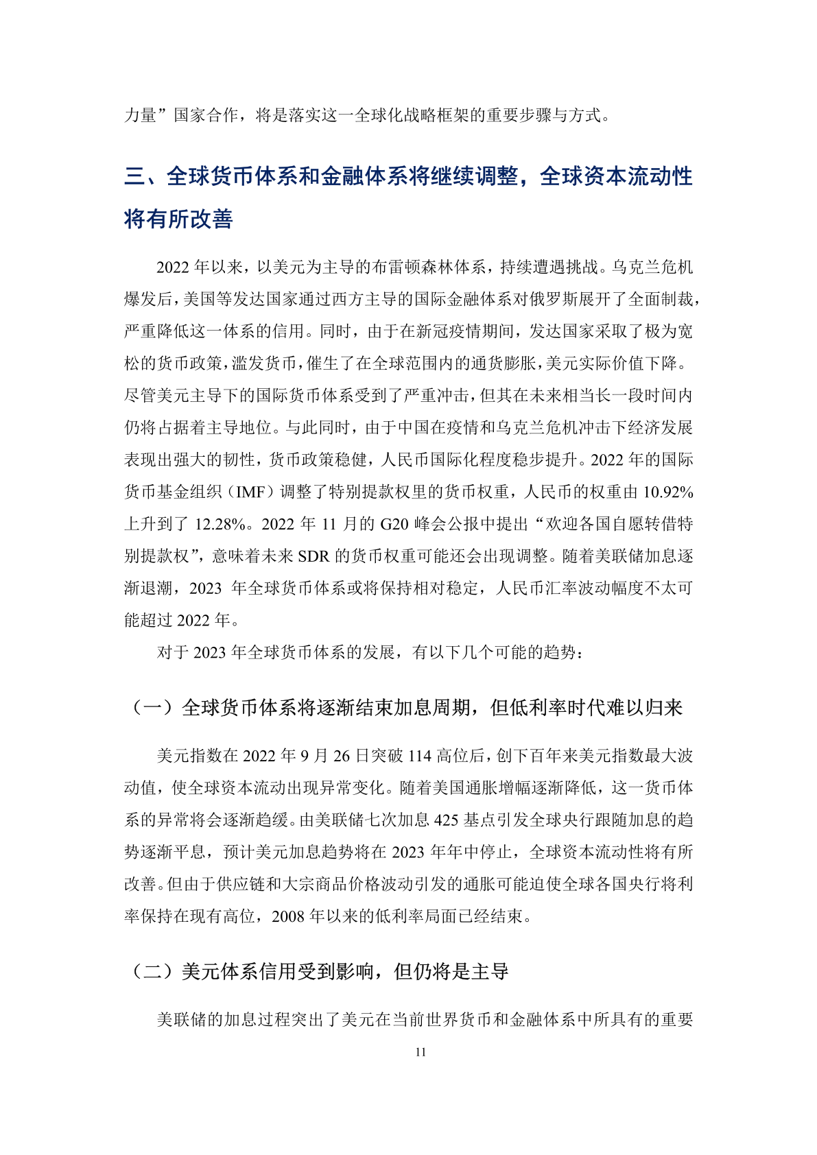 三、全球货币体系和金融体系将继续调整,全球资本流动性将有所改善;美元对全球影响力依旧,但长期持续的低利率局面将结束;部分国家债务风险增加;人民币国际化将继续得到推进。