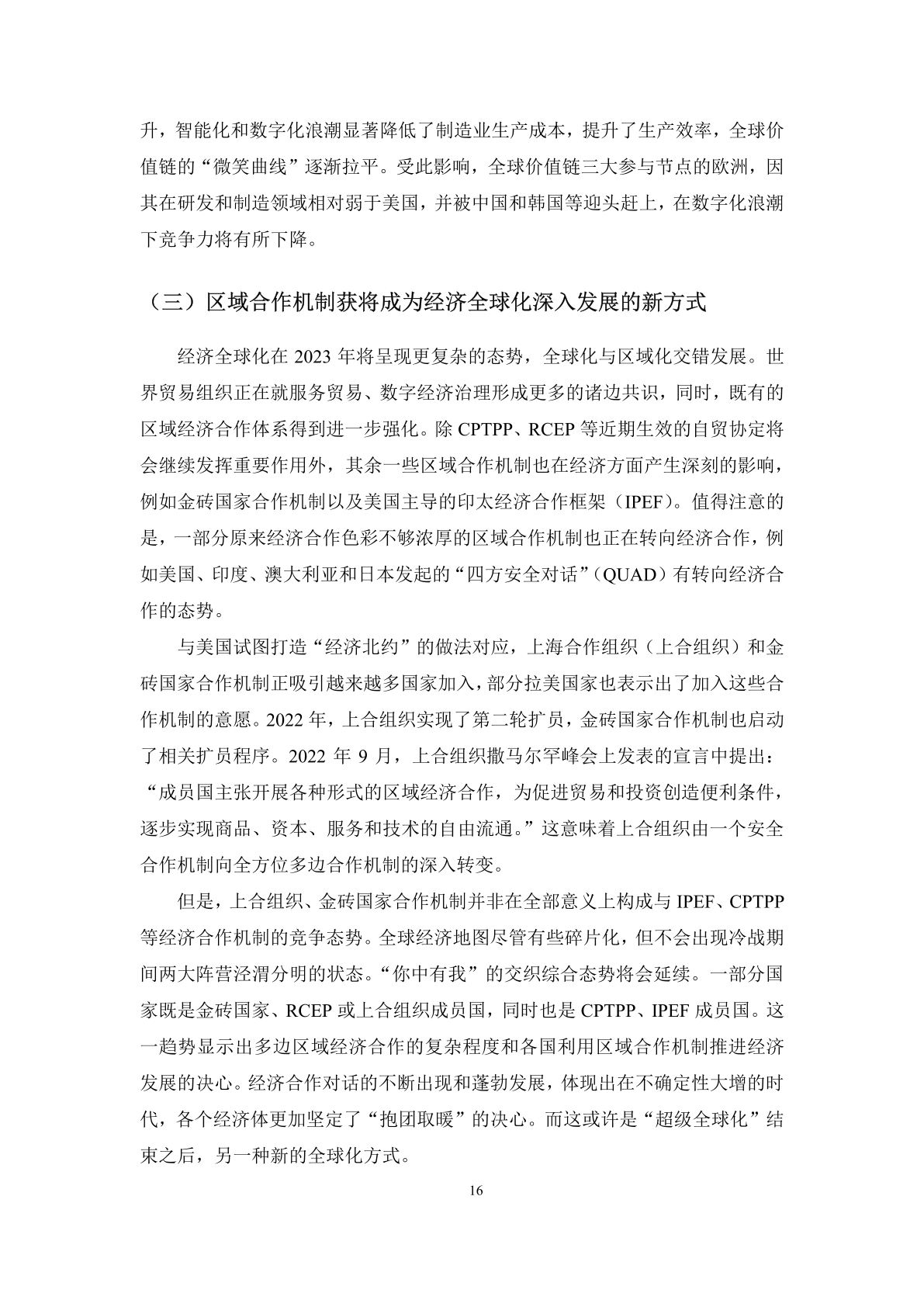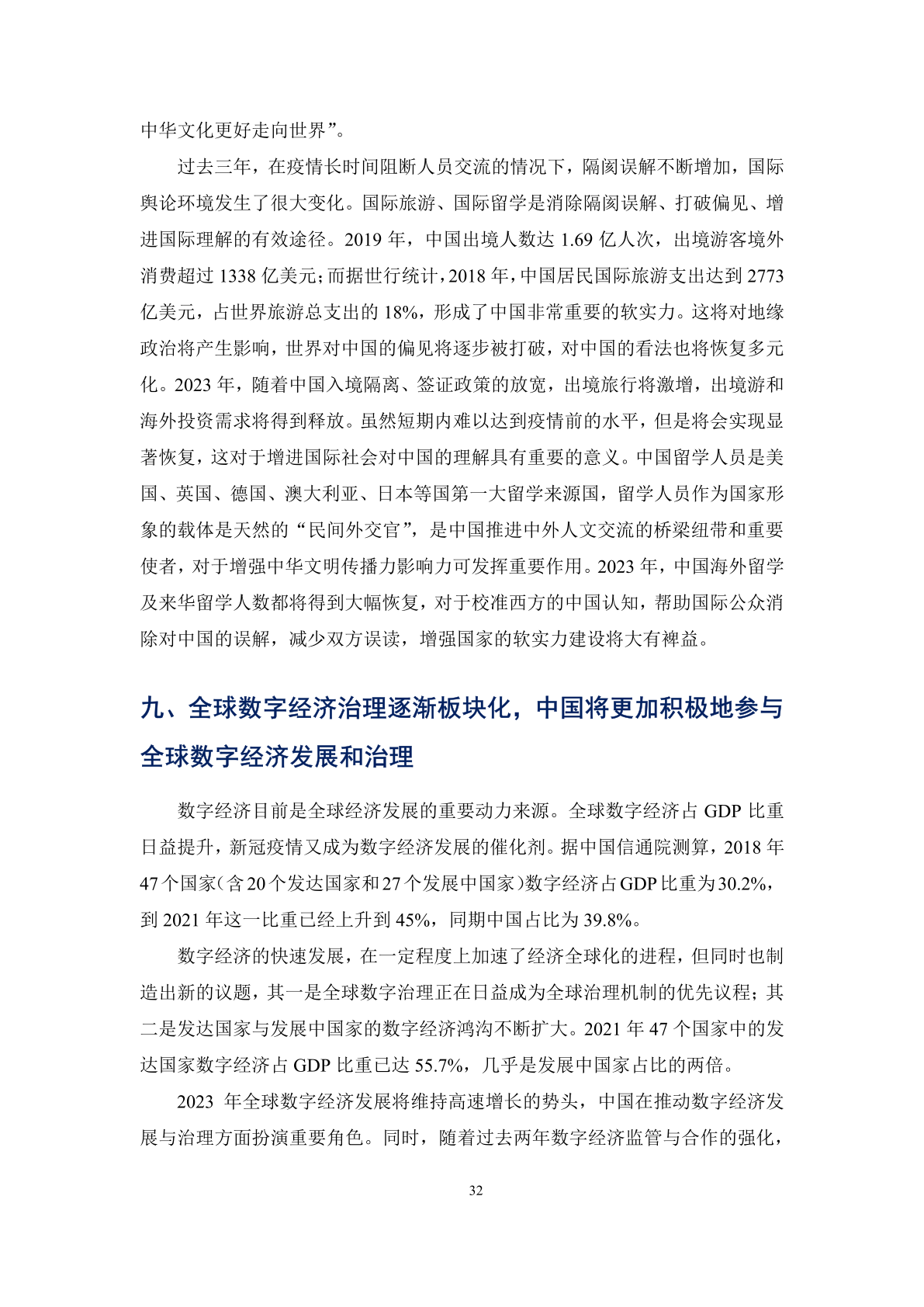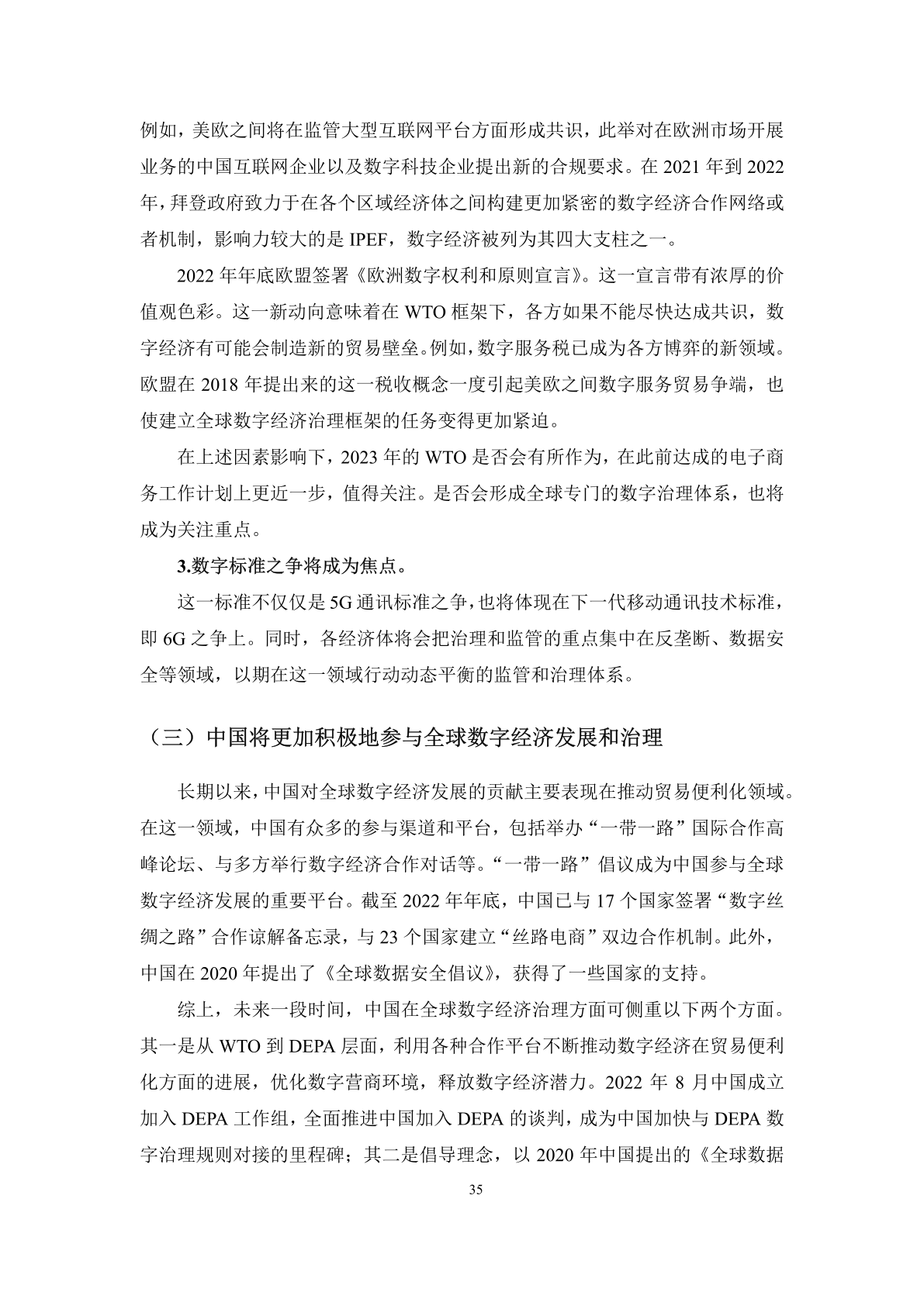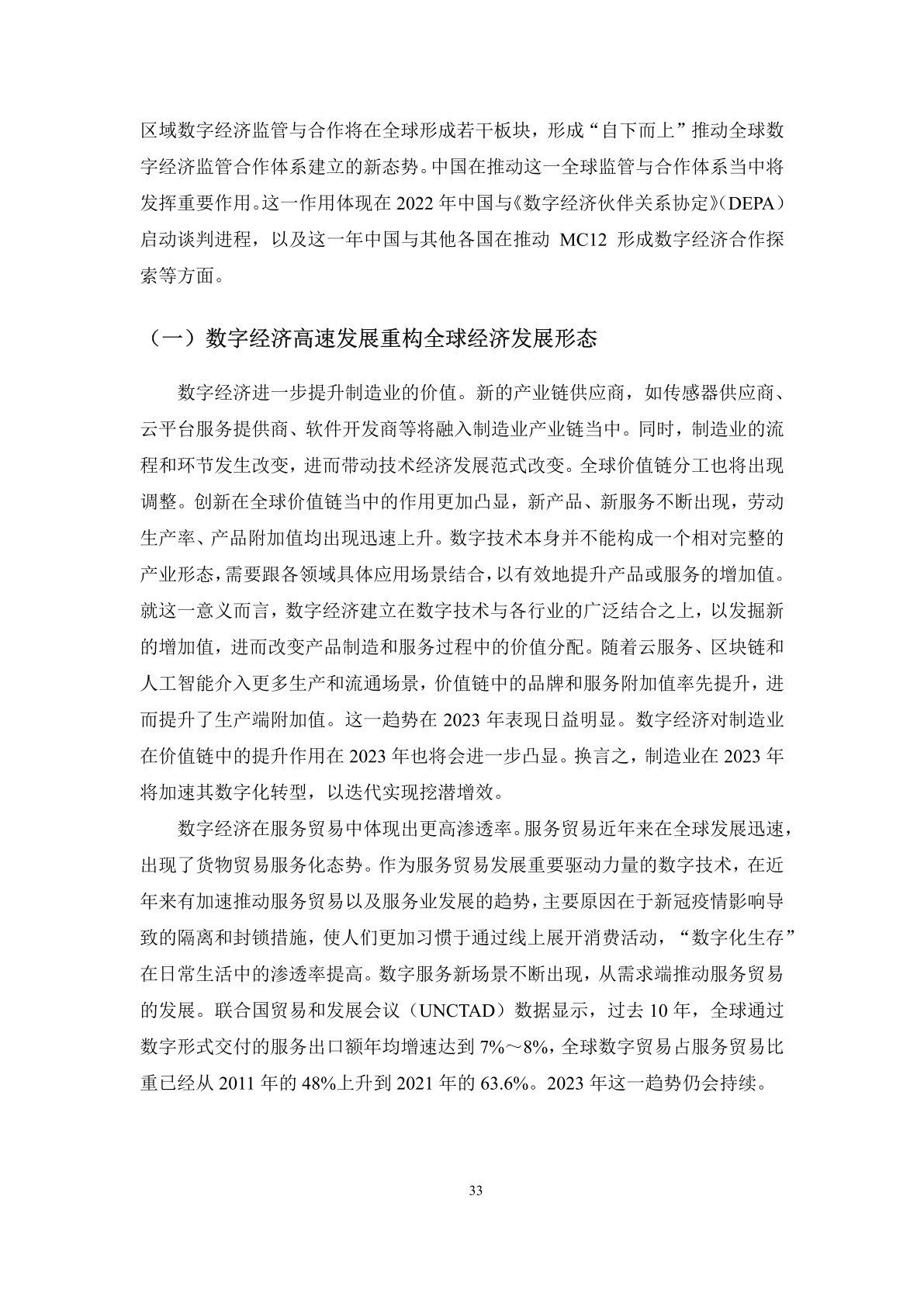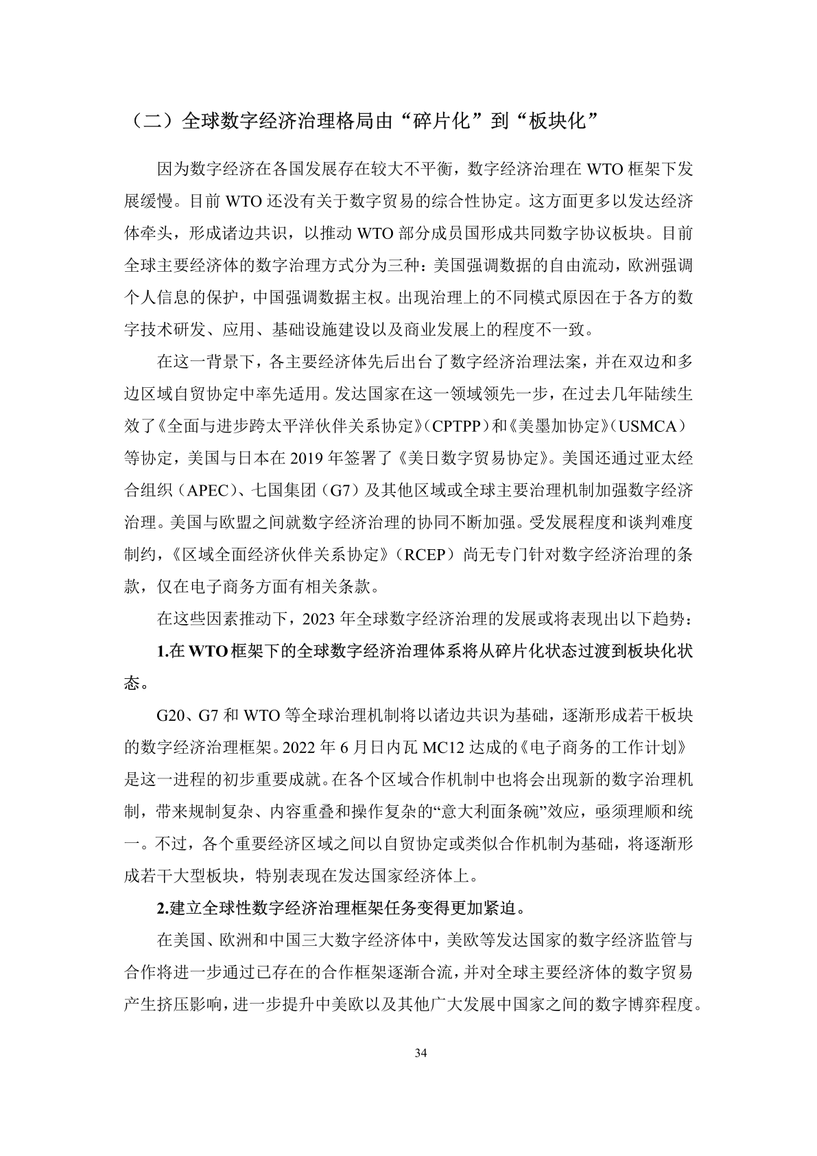 九、全球数字经济治理从“碎片”走向“板块”,形成“自下而上”推动全球数字经济监管合作体系建立的新态势;中国将更加积极地参与全球数字经济发展和治理。