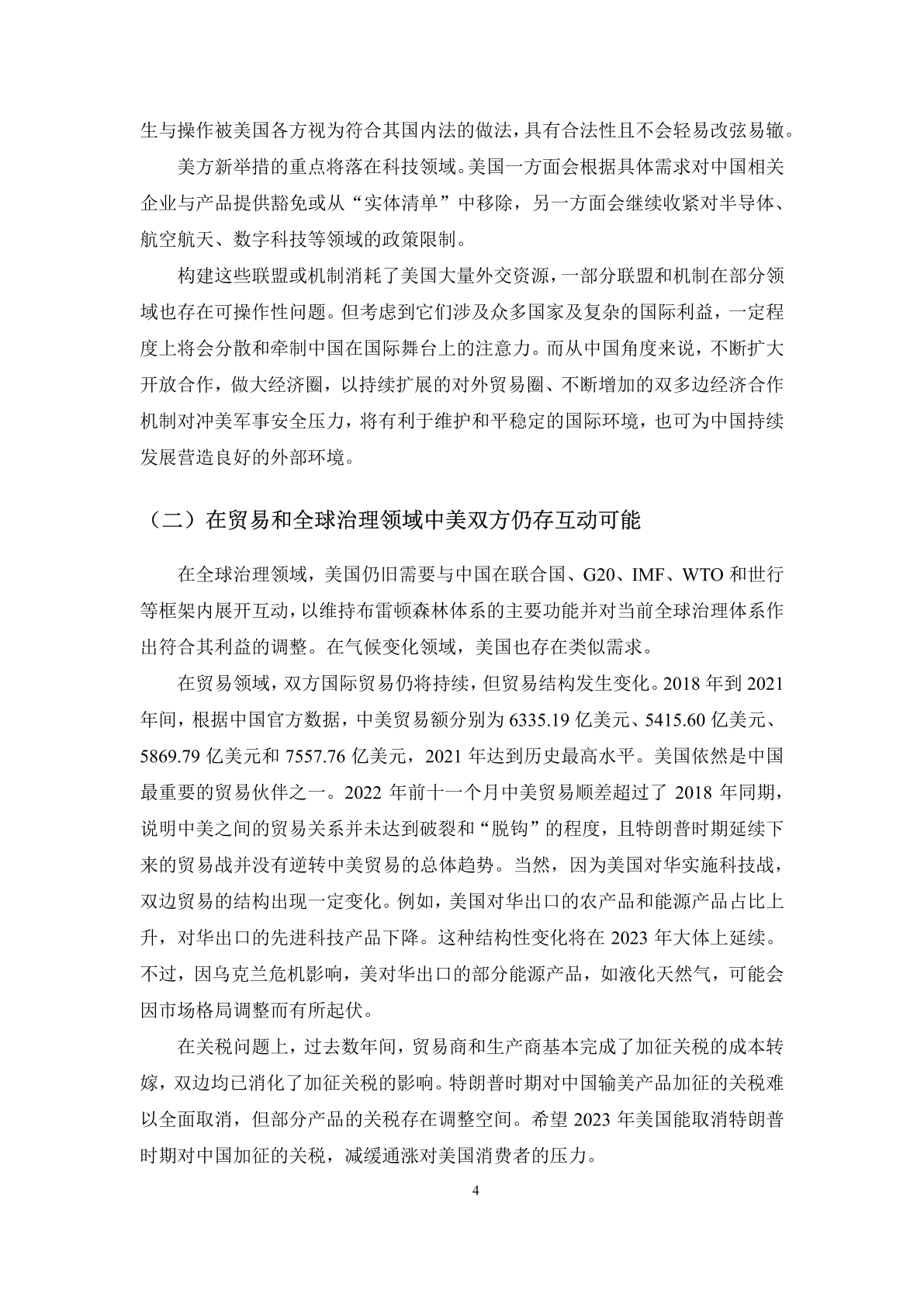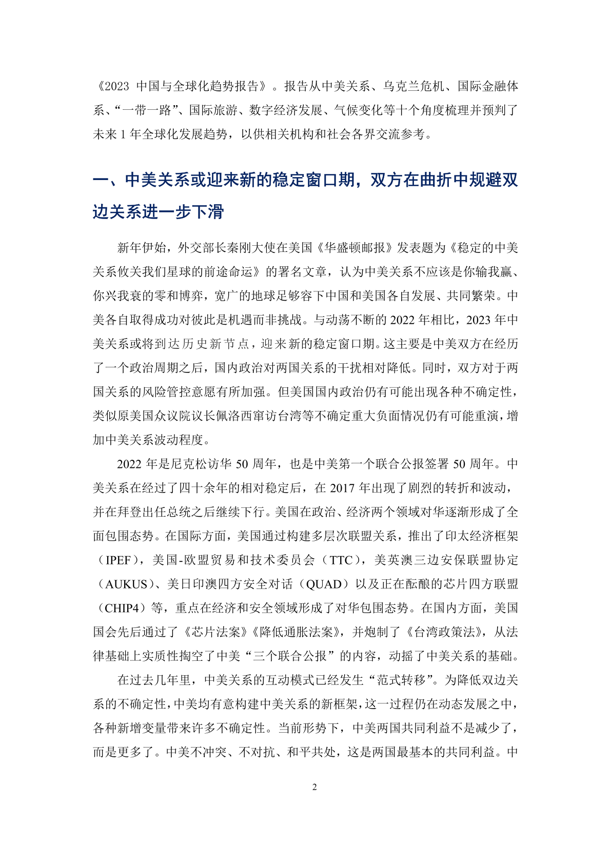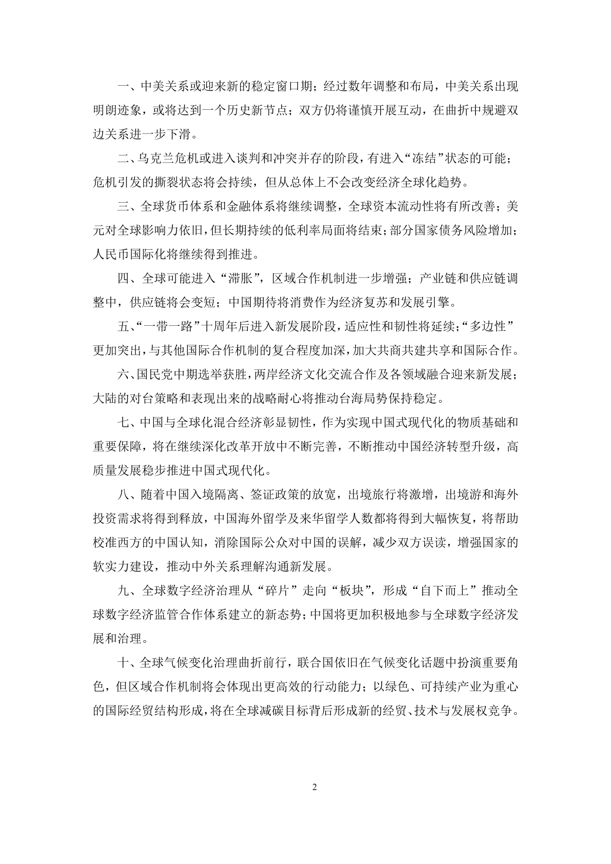 一、中美关系或迎来新的稳定窗口期;经过数年调整和布局,中美关系出现明朗迹象,或将达到一个历史新节点;双方仍将谨慎开展互动,在曲折中规避双边关系进一步下滑。