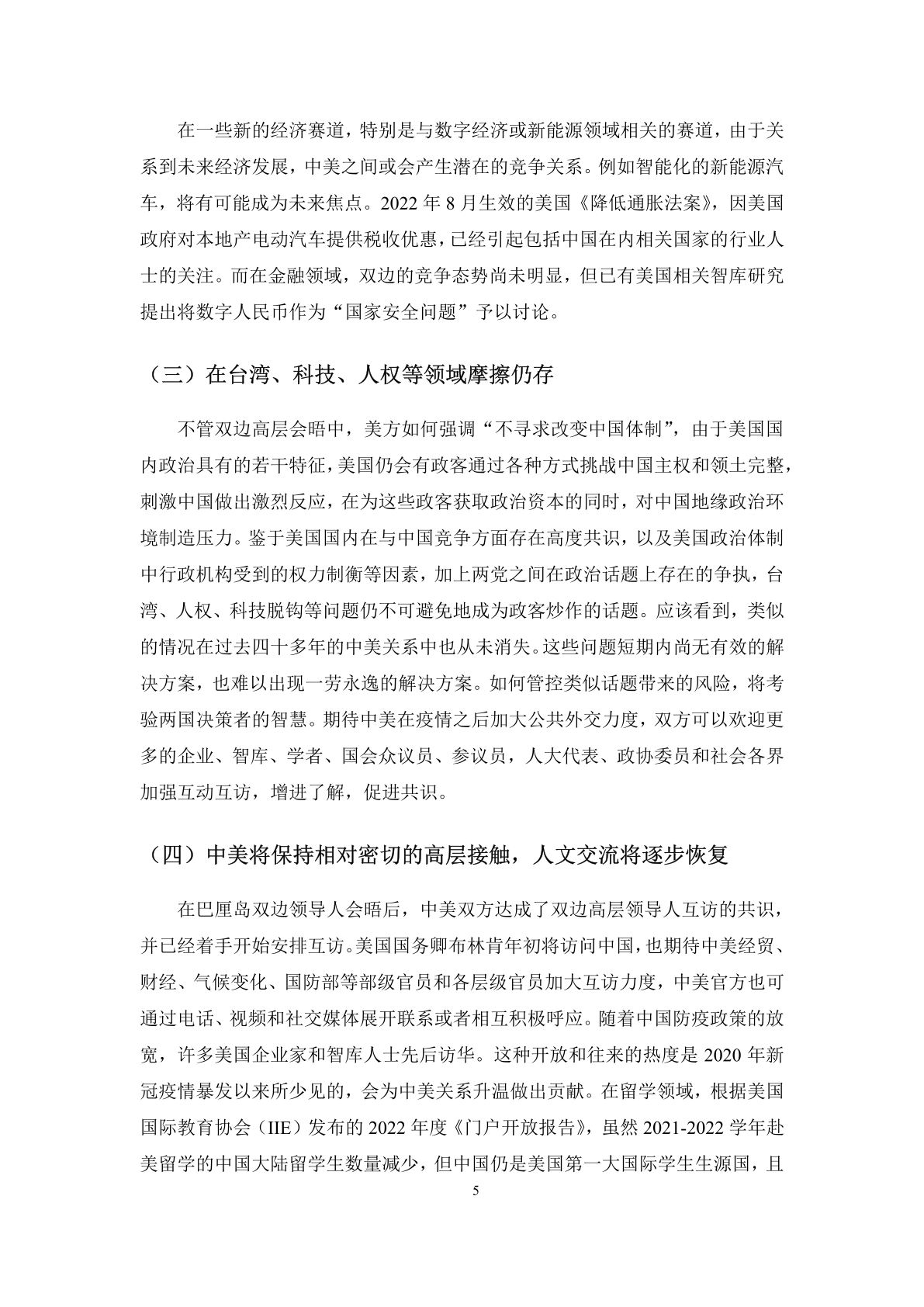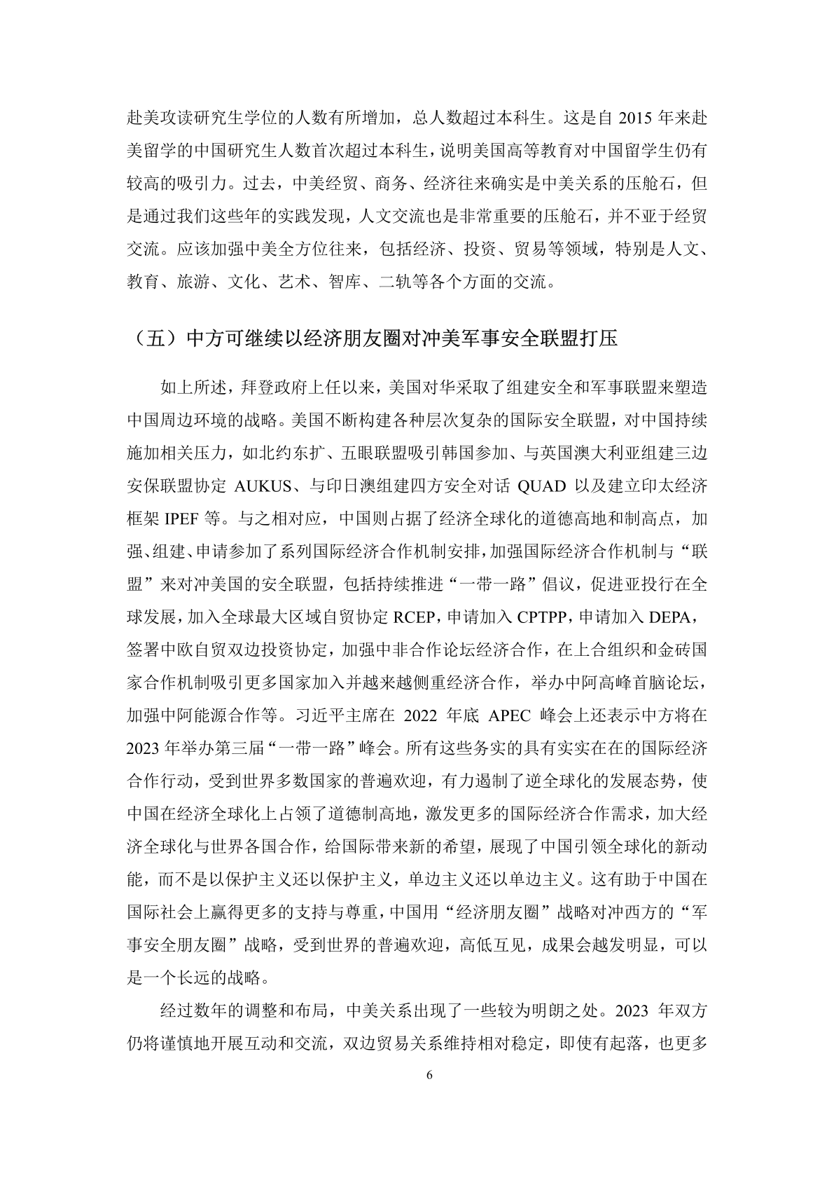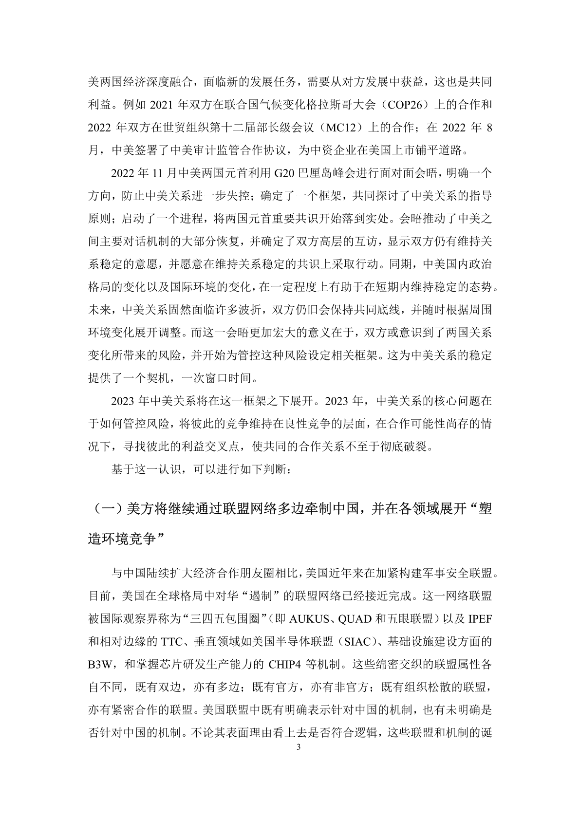 一、中美关系或迎来新的稳定窗口期;经过数年调整和布局,中美关系出现明朗迹象,或将达到一个历史新节点;双方仍将谨慎开展互动,在曲折中规避双边关系进一步下滑。