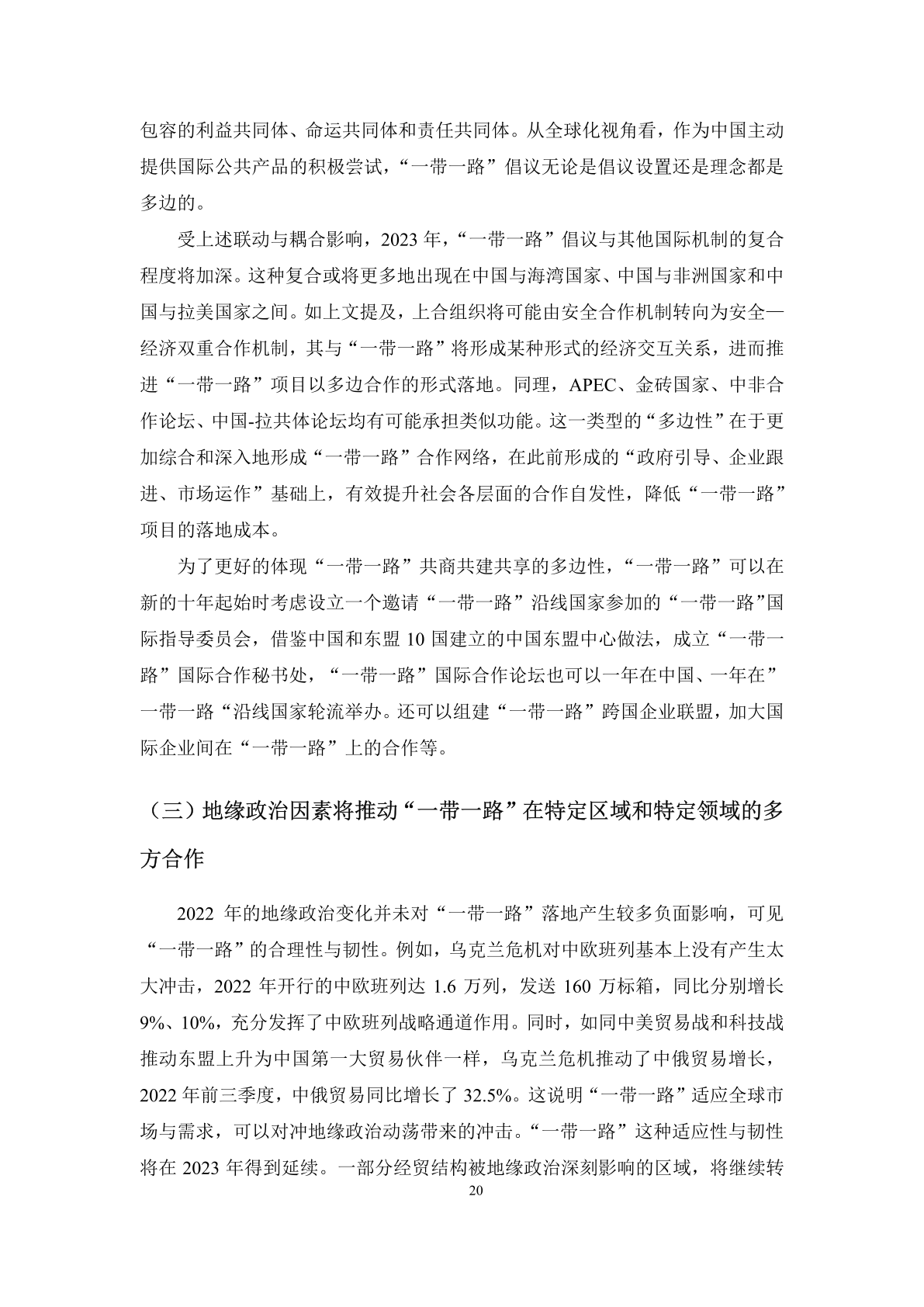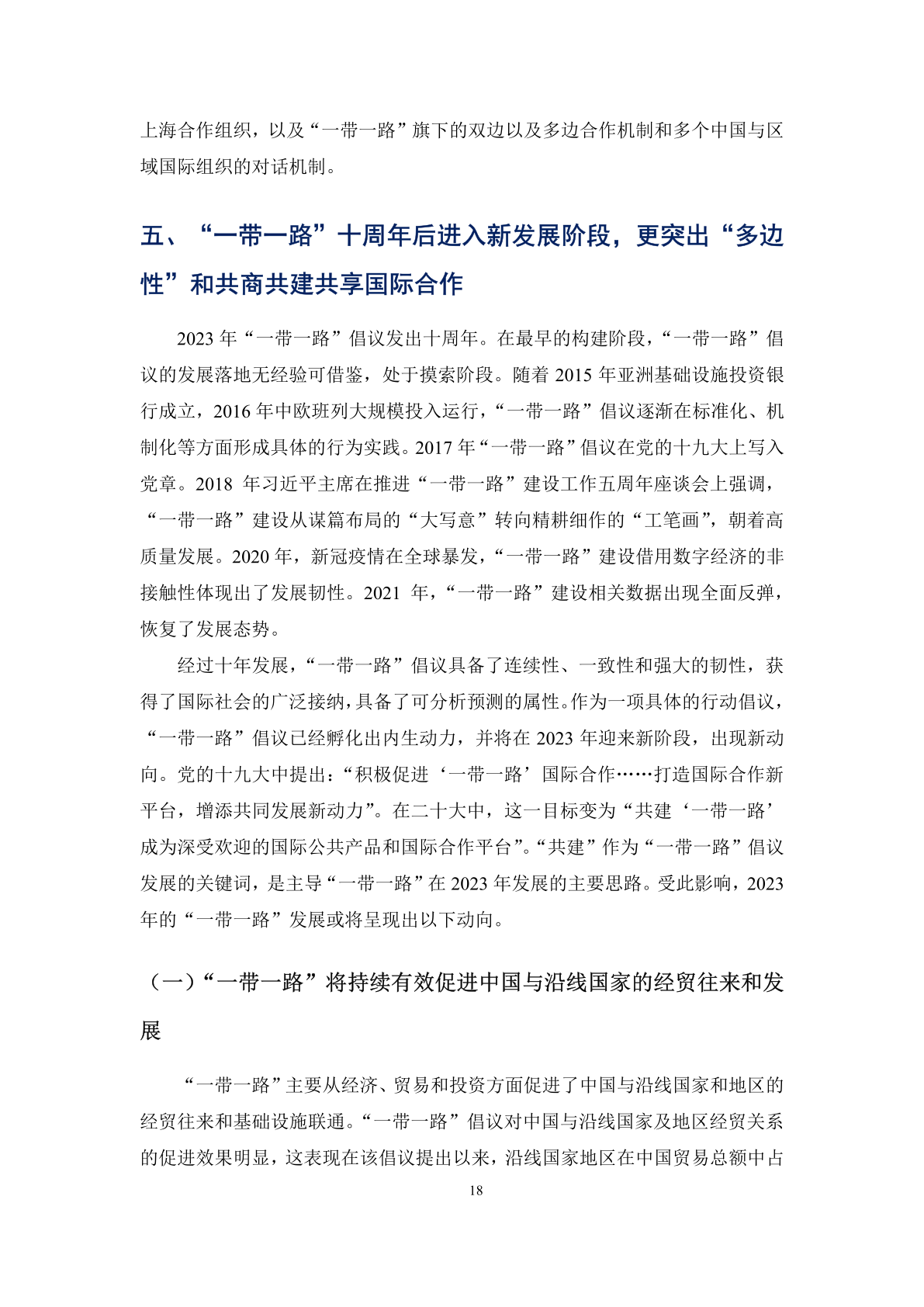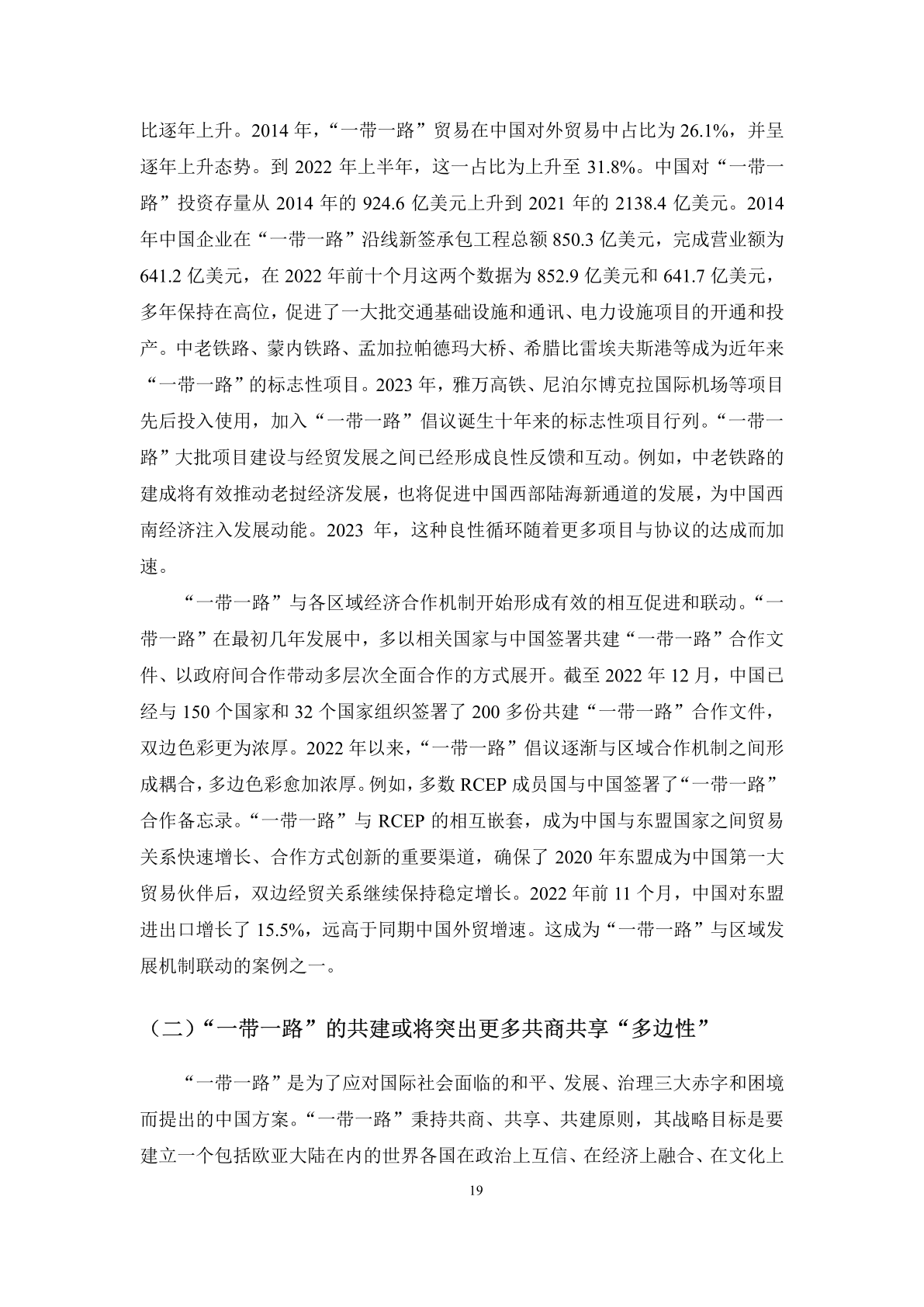 五、“一带一路”十周年后进入新发展阶段,适应性和韧性将延续;“多边性”更加突出,与其他国际合作机制的复合程度加深,加大共商共建共享和国际合作。