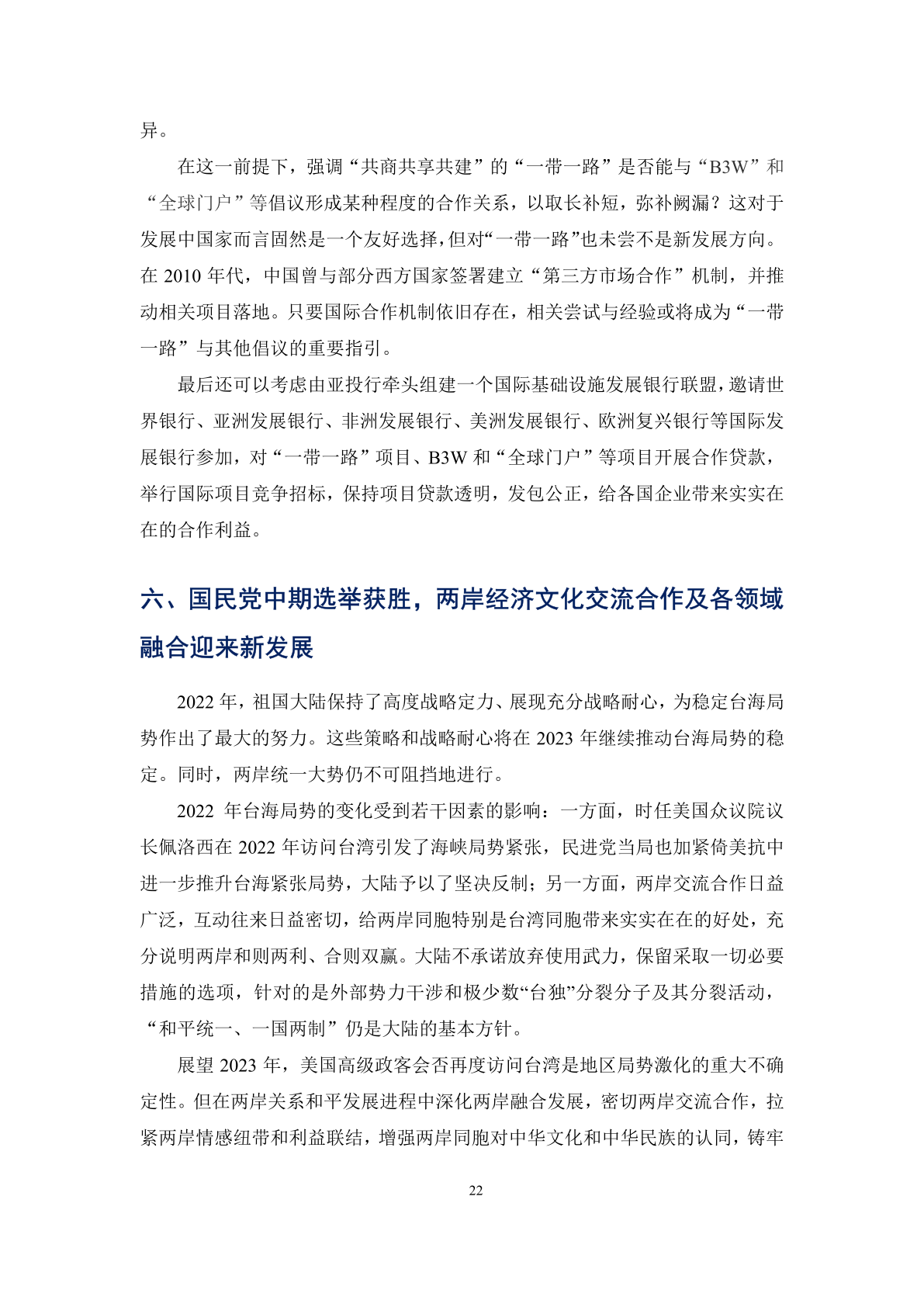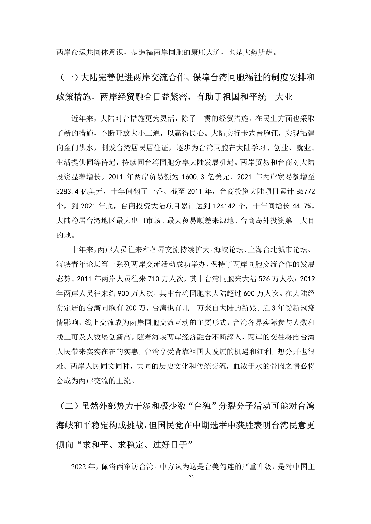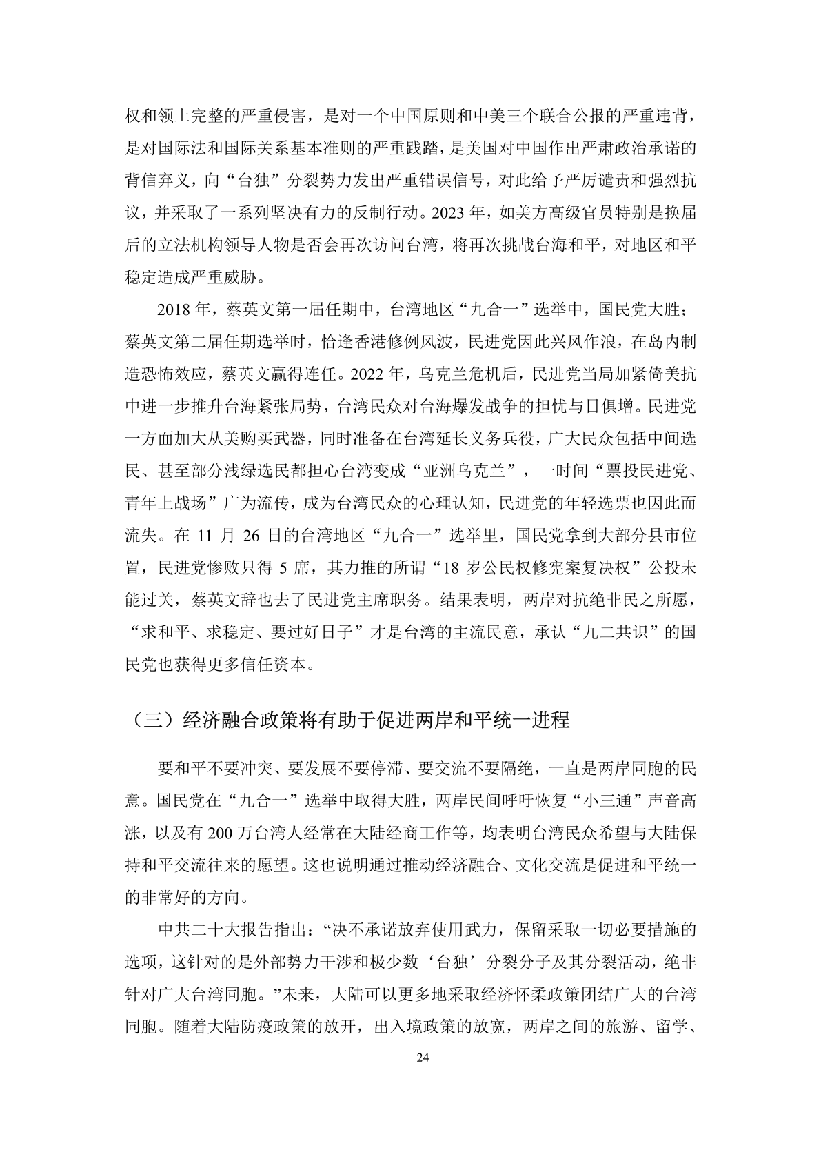 六、国民党中期选举获胜,两岸经济文化交流合作及各领域融合迎来新发展;大陆的对台策略和表现出来的战略耐心将推动台海局势保持稳定。
