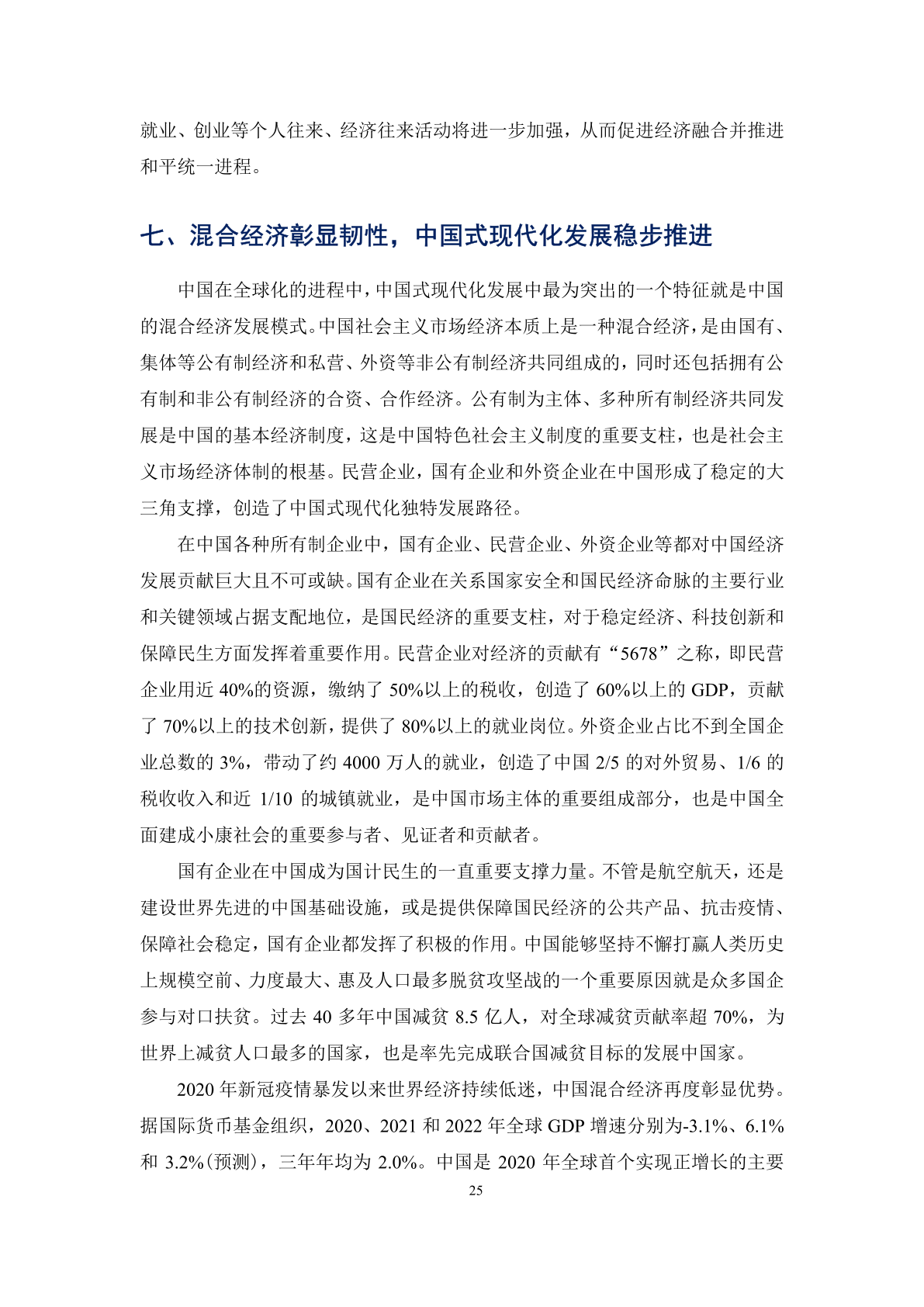 七、中国与全球化混合经济彰显韧性,作为实现中国式现代化的物质基础和重要保障,将在继续深化改革开放中不断完善,不断推动中国经济转型升级,高质量发展稳步推进中国式现代化。