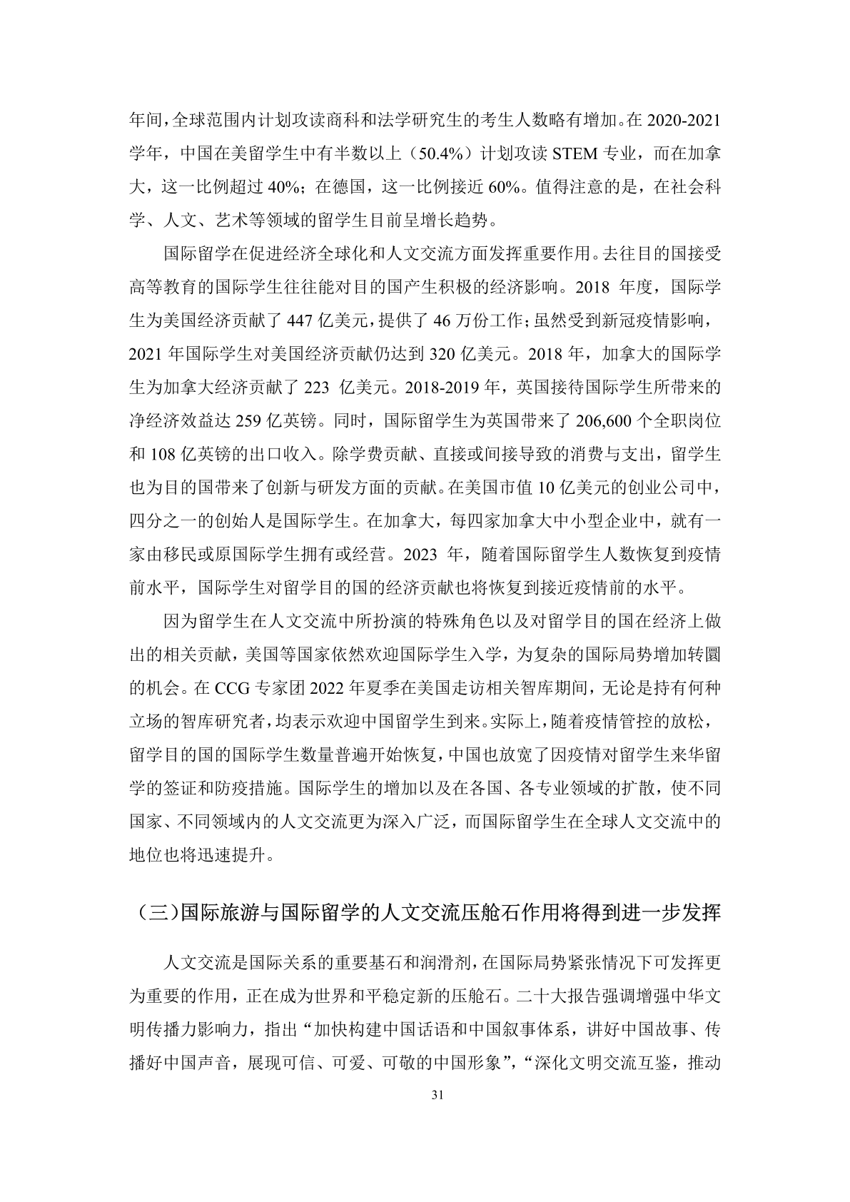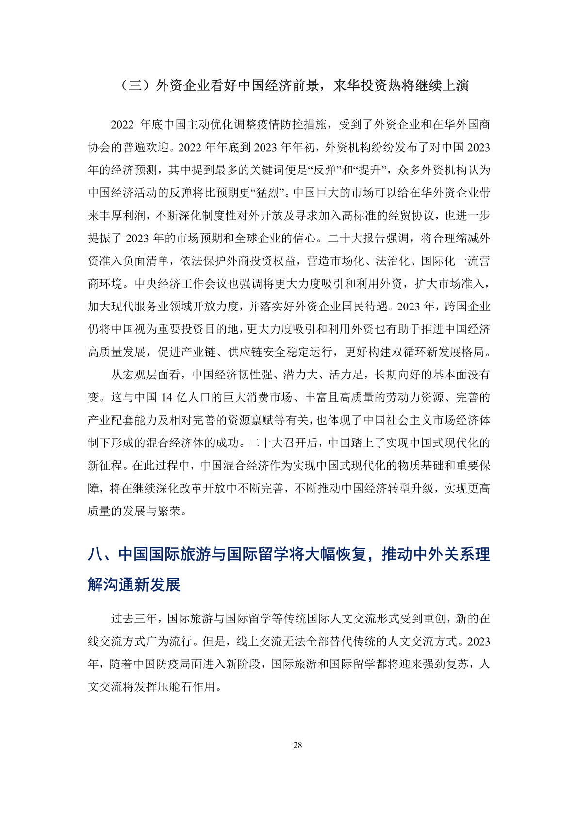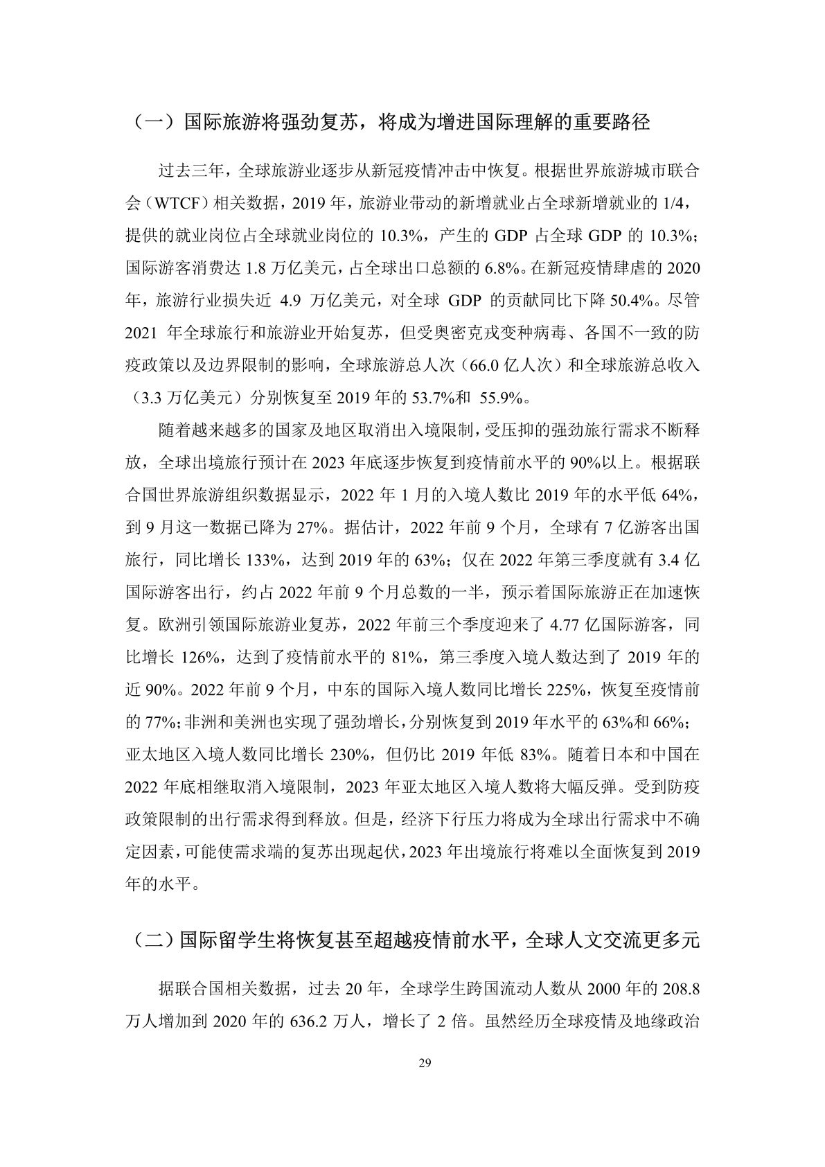 八、随着中国入境隔离、签证政策的放宽,出境旅行将激增,出境游和海外投资需求将得到释放,中国海外留学及来华留学人数都将得到大幅恢复,将帮助校准西方的中国认知,消除国际公众对中国的误解,减少双方误读,增强国家的软实力建设,推动中外关系理解沟通新发展。