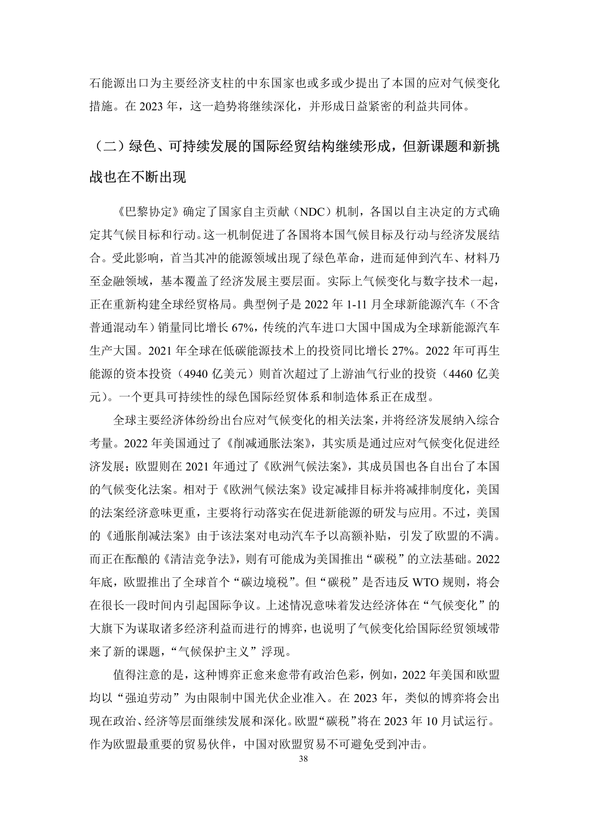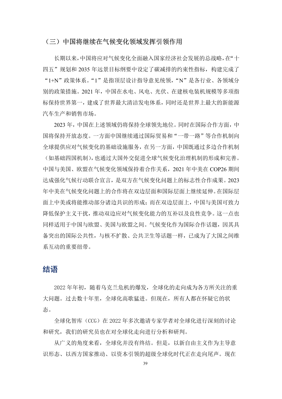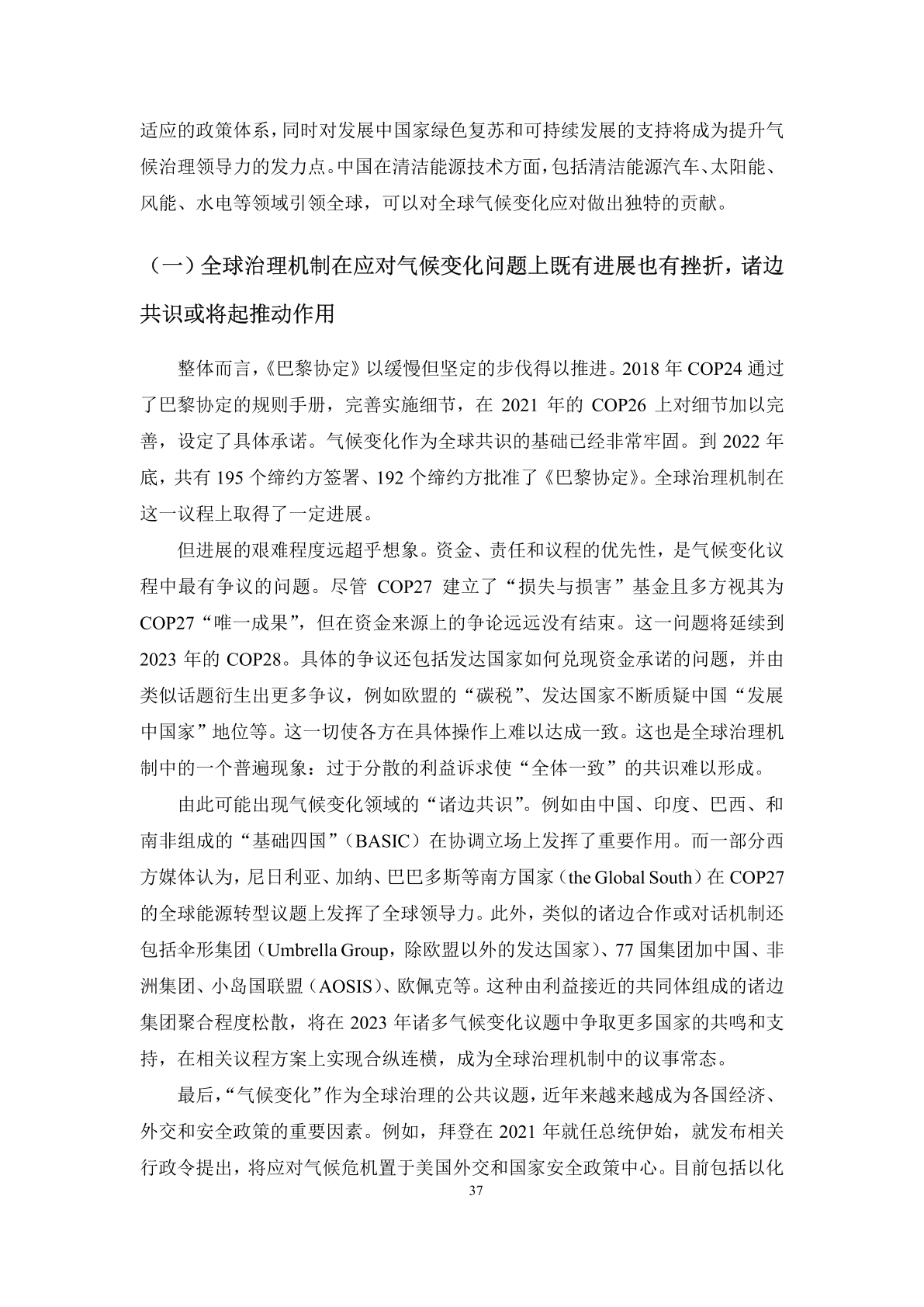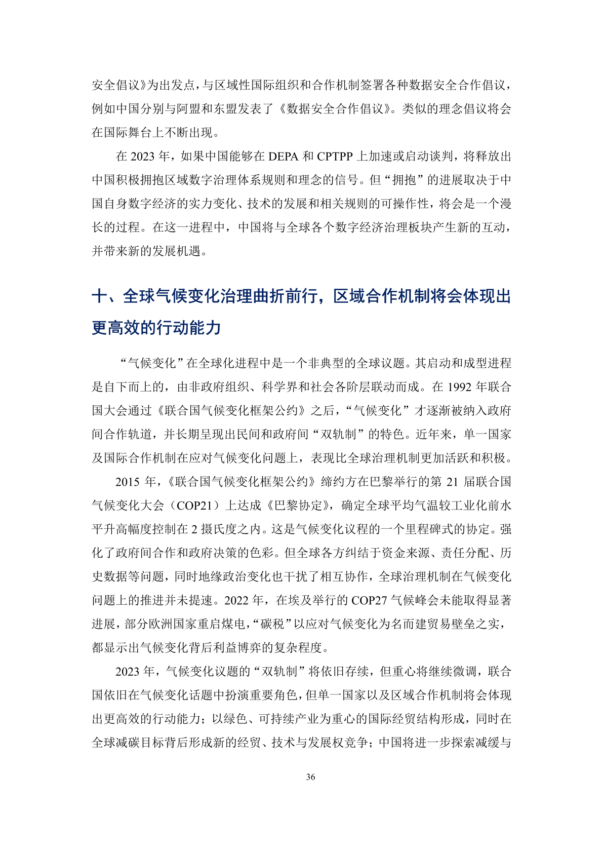十、全球气候变化治理曲折前行,联合国依旧在气候变化话题中扮演重要角色,但区域合作机制将会体现出更高效的行动能力;以绿色、可持续产业为重心的国际经贸结构形成,将在全球减碳目标背后形成新的经贸、技术与发展权竞争。