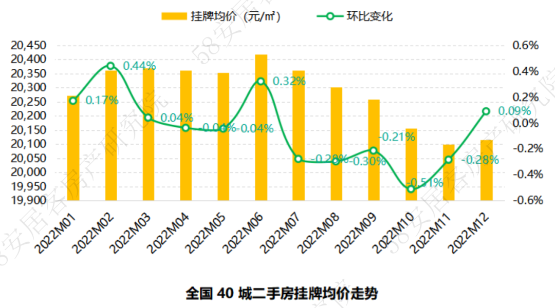 2022年,全国40城二手房挂牌均价基本维持在20300元/平方米左右的水平小幅震荡,主要还是政策刺激的效应促成房价的稳定,不过下半年购房需求没有得到释放,房东信心也相对不足,挂牌价格也逐步下跌。