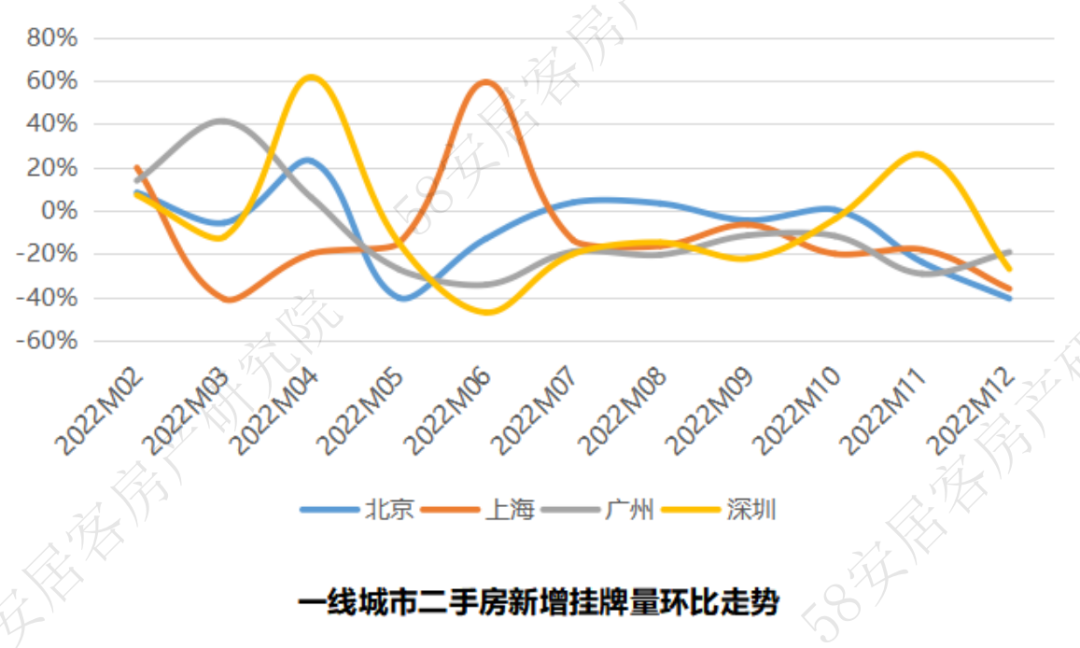 一线城市新增挂牌走势来看,年底相比年初都出现了较大幅度的减少,减幅都在七成左右,尤其是进入下半年,基本上每个月都在明显减少,尤其是进入12月份,防疫政策的调整对新增房源影响较大。