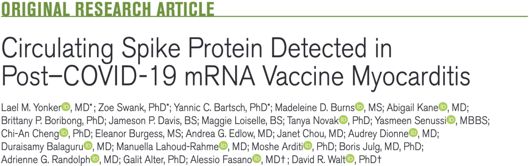 巧合的是,几乎在同一时间,哈佛大学David R. Walt和Lael M. Yonker团队在《循环》上发表的一项研究成果,将mRNA疫苗相关心肌炎的矛头也指向了S蛋白[5]。