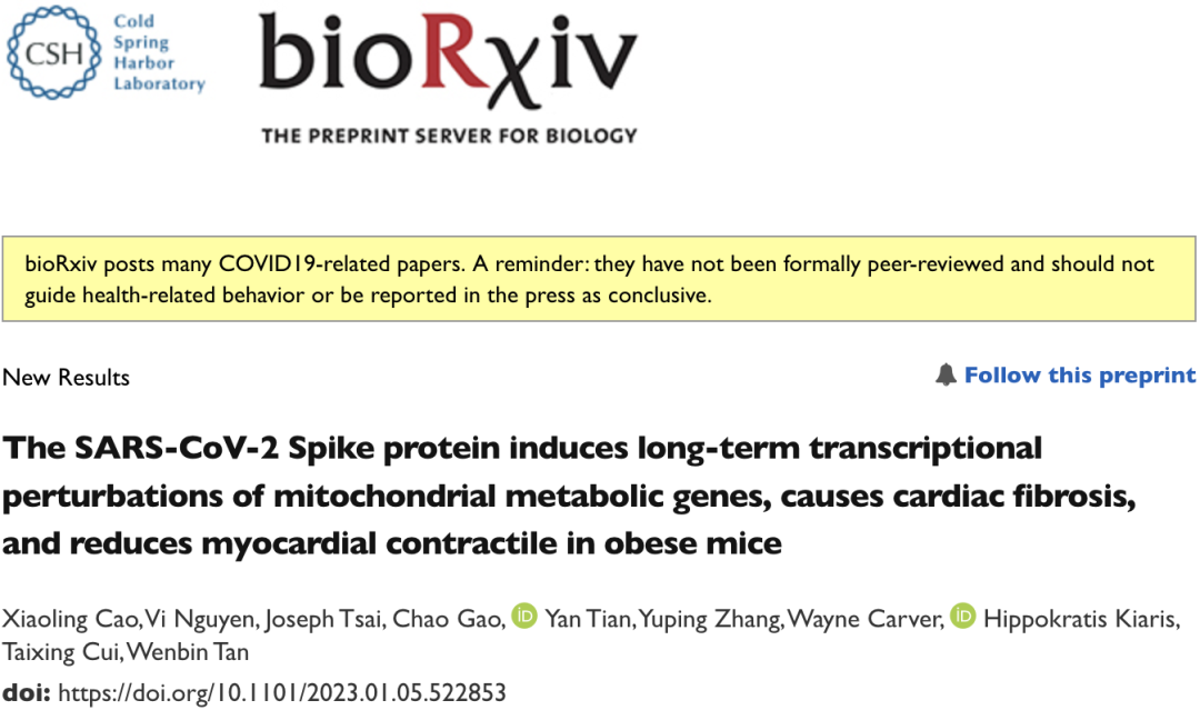 他们发现,在高脂饮食诱导的肥胖小鼠体内,新冠病毒的S蛋白可以诱导心肌细胞线粒体代谢相关基因的长期转录抑制,并导致心肌纤维化和收缩能力损伤。这一发现让我们对新冠相关的心肌病有了更深入的认知。