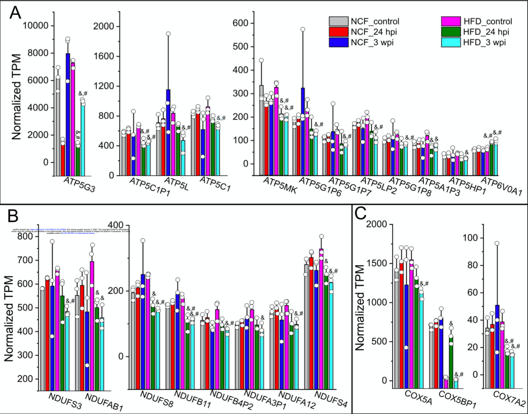 值得注意的是,涉及线粒体呼吸链(MRC)的三个基因家族被显著下调,包括ATP合成酶、NADH:泛醌氧化还原酶家族(NDUFs)和细胞色素c氧化酶(COX)。