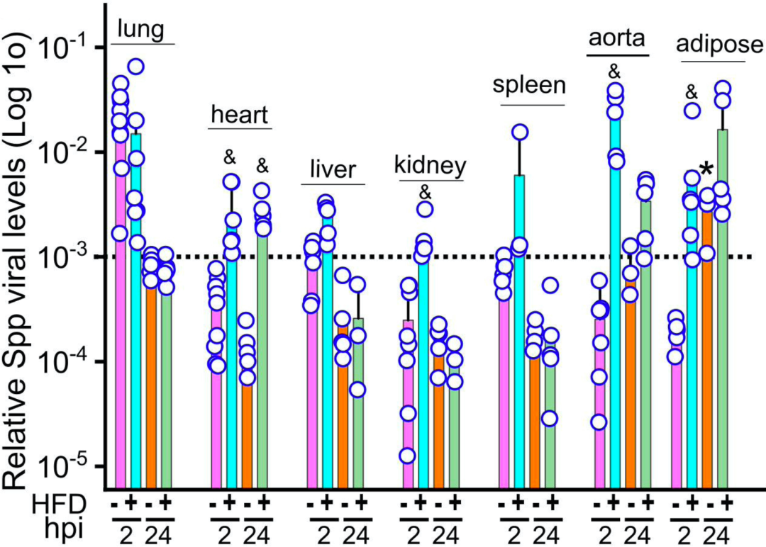 SR-B1的表达情况让他们感到意外,与正常饮食组小鼠相比,高脂饮食组小鼠的心脏、脂肪组织和肾脏细胞SR-B1蛋白水平明显增加,而在肝脏、肺和脾脏细胞却没有增加。与之相对应的是,与正常饮食组小鼠相比,高脂饮食组小鼠在接种Spp病毒两小时后,病毒选择性地在心脏、肾脏、主动脉和脂肪组织中显著增加,而且24小时后仍在心脏、主动脉和脂肪组织中积累。