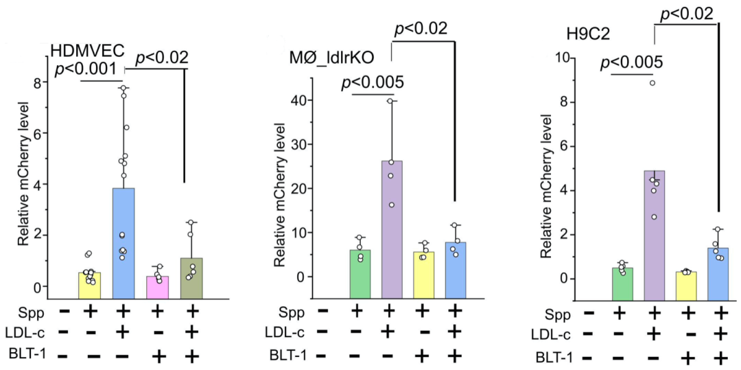 基于上述三个细胞系,他们发现低密度脂蛋白胆固醇(LDL-c)与Spp的亲和力非常高,LDL-c可以联合细胞表面的B类1型清道夫受体(SR-B1)增强Spp进入细胞的能力,而SR-B1抑制剂BLT-1可以抑制LDL-c增强Spp进入细胞的能力。这也与之前的研究结果相一致[3]。