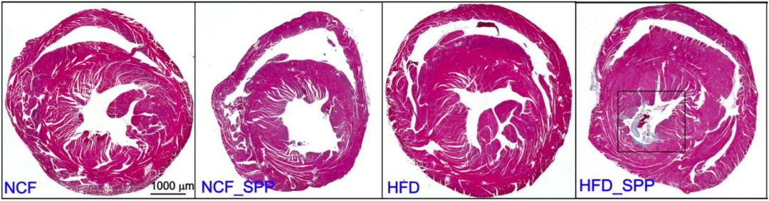 在接种Spp病毒6周后,Wenbin Tan团队观察了小鼠心脏纤维化的情况。正常饮食小鼠,无论是否接种过病毒,6周后两组小鼠心脏的纤维化情况没有差异。而接种Spp病毒的高脂饮食小鼠,心肌明显出现纤维化。