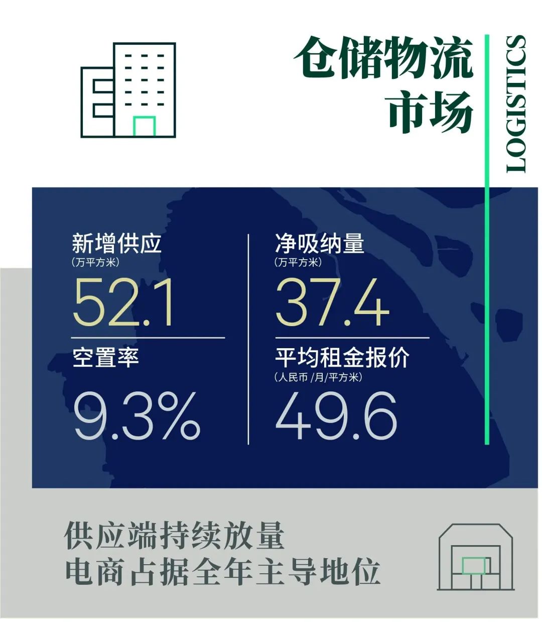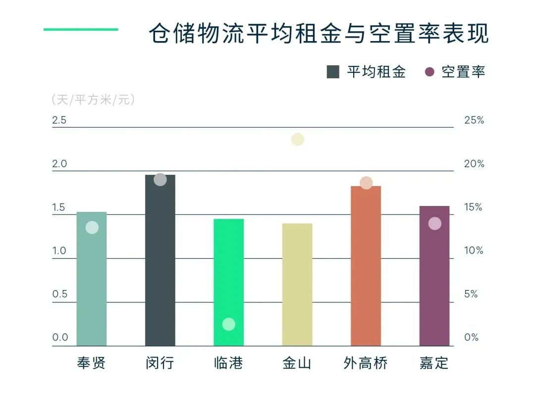 2022年上海物流仓储市场共录得七个项目,总计52.1万平方米的新增供应。奉贤、闵行、临港等多个子市场放量之下,推动全市高标库总体量超过700万平方米。全年净吸纳量录得37.4万平方米。综合整体供需情况,空置率同比小幅上行1.5个百分点 至9.3%。租金方面,以临港和闵行子市场领涨全市平均租金,同比去年上涨2.3%至每月每平方米49.6元。