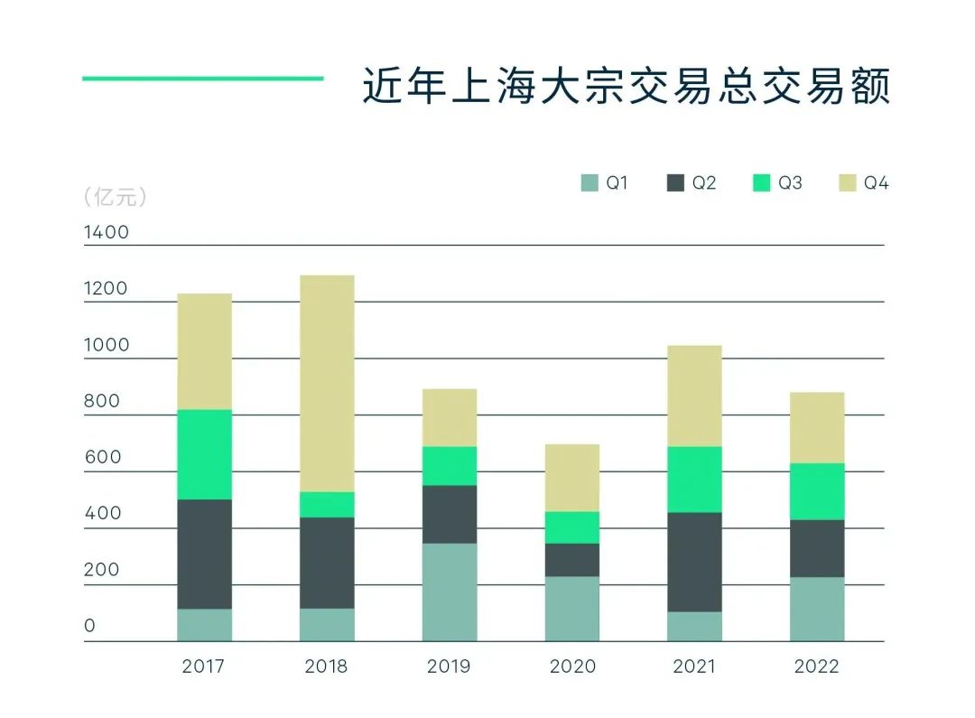 2022年,上海物业投资市场录得57笔大宗交易,交易金额达879.5亿元,同比下降8.3%。尽管经济增长面临挑战,而伴随疫情防控政策的不断优化,大宗物业投资市场于年末持续升温,全年交易总额优于2020年水平。