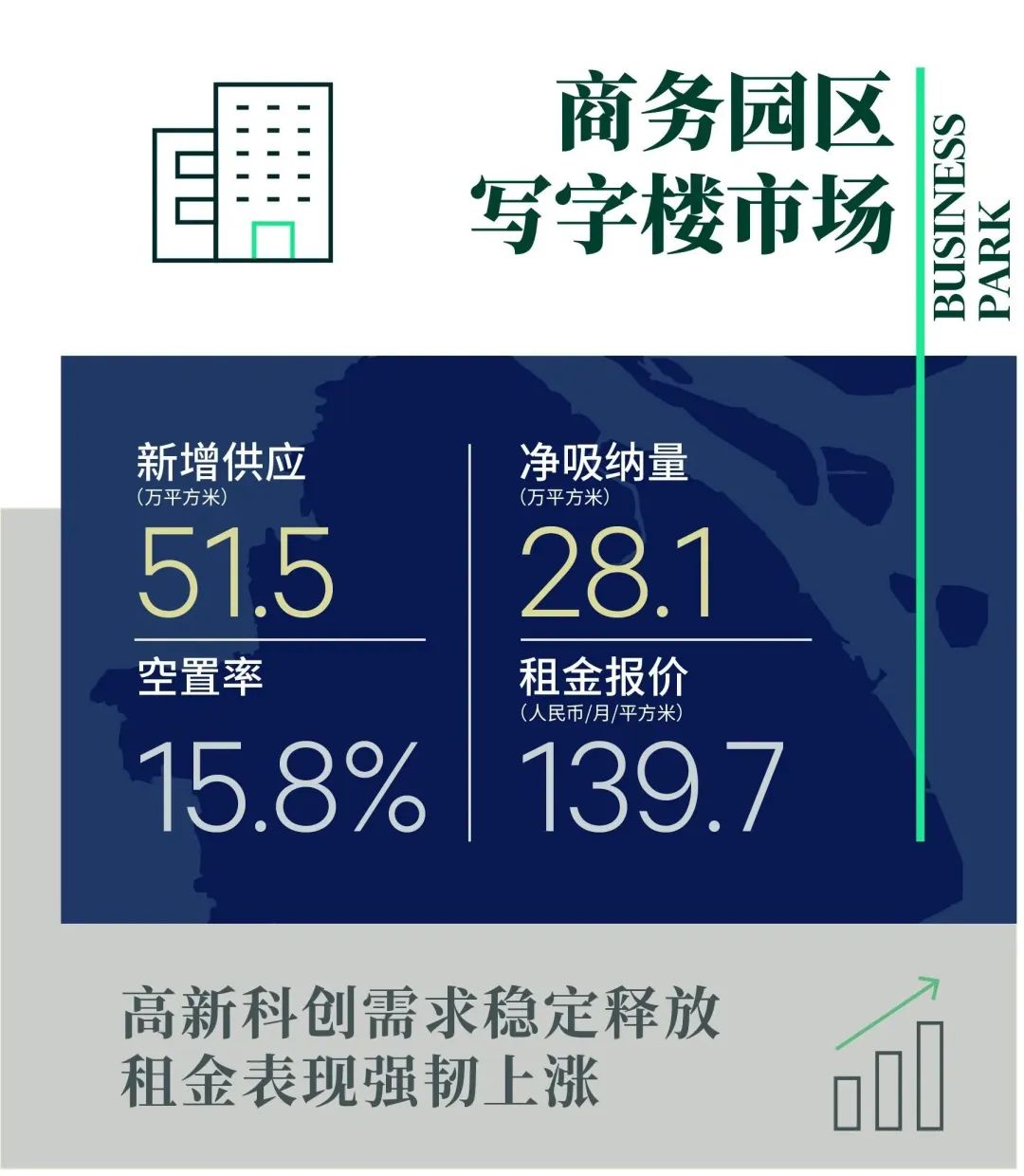 对比各子市场表现,金桥板块围绕TMT产业积极布局,全年保持去化韧性,以绝对领先的净吸纳量成为年度最活跃板块,空置率累计下行3.2个百分比。张江板块通过吸引企业购置办公房产自用,在四季度强势去化,推动板块活跃度并进一步加深龙头企业在板块内部的布局;坚挺的产业需求推动租金累计稳定上涨1.7%。漕河泾板块吸引优质企业总部落户,但新增供应集中且受到今年市场遇冷情况影响,整体出租率不及往年预期,导致板块空置率持续走高至12.7%,同比上升10.6个百分比,创历史新高。临空、市北板块虽在二季度受到小面积租户退租影响,但后期回暖显著。各板块深厚的产业基础和全面的产业服务,为租金打造坚实护城河,在政府纾困政策和市场生命力带动下各子板块租金水平均有不同程度的上涨,拉动全市平均租金报价持续攀升至每月每平方米139.7元,同比上升1.2%。