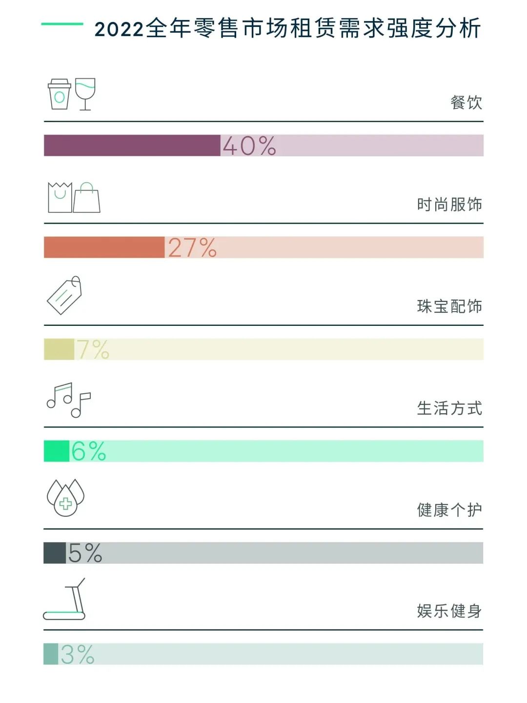 时尚服饰品类需求占比27%,其中潮流女装、运动以及设计师品牌需求较为亮眼。疫情之后,随着露营经济的迅速出圈,运动类品牌向户外及专业运动类倾斜,KOLON SPORT、SALOMON以及CHUMS等品牌布点积极。珠宝配饰类需求占比7%,包括老庙黄金、潮宏基以及周大福在内的传统黄金珠宝品牌热度再度走高,品牌顺应中国元素焕新产品设计,外加其自身的保值属性,黄金饰品受到年轻消费客群的追捧。
