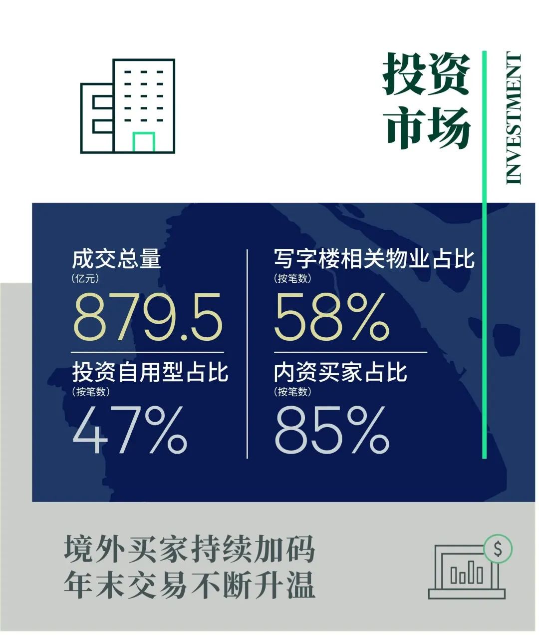 从全年大宗交易的物业类型来看,写字楼物业仍为主流标的,占比58%。临近年尾,市场相继录得两笔单笔交易超50亿元的商办写字楼投资交易,可见投资者对于商办写字楼的关注程度有所提升。以生命科学为主题的园区物业成交依旧活跃,张江、临空等核心商务园区子板块均在年内录得增值型交易。另外,自用买家比重相对可观,产业聚集导向作用下,科技巨头购置位于徐汇滨江的优质甲级楼宇,金融机构依旧青睐黄浦滨江、北外滩等板块,而作为后起之秀的能源企业年内交易总额位列第一,多选址苏河湾及大虹桥板块。除此之外,交易标的延续多元趋势,以社区商业为代表的零售物业需求稳定,工业厂房及长租公寓交易占比连续三年录得增长。