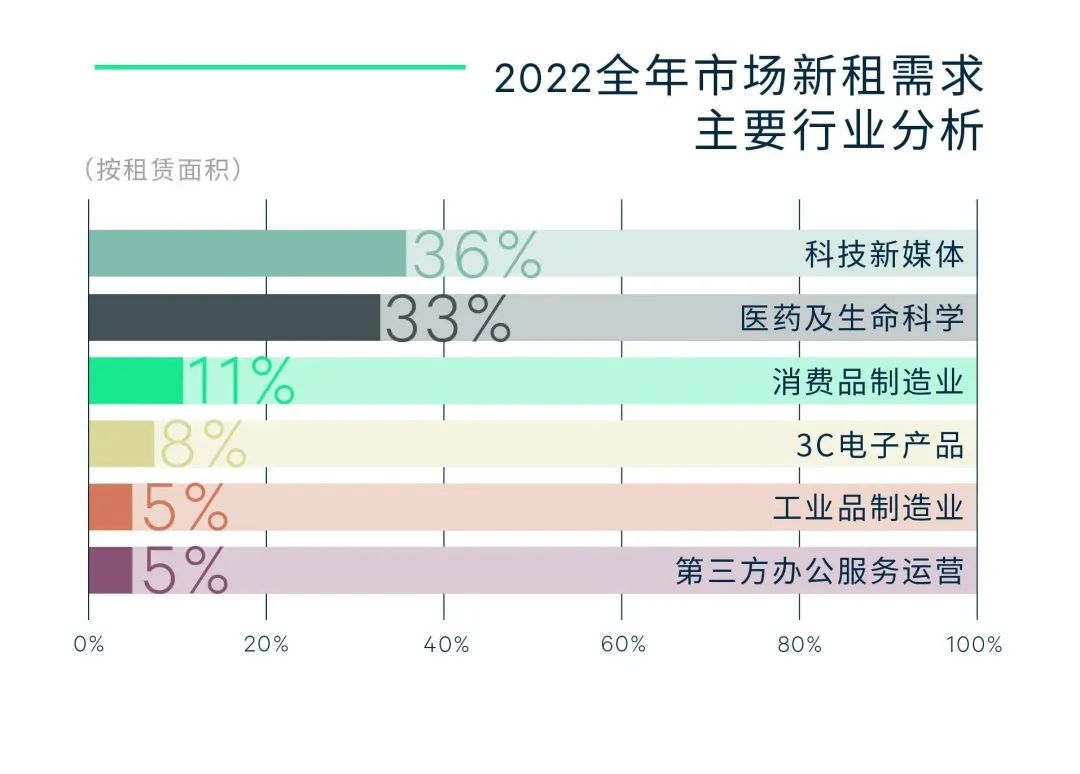 行业需求方面,TMT行业以36%占比保持租赁需求首位,其中华为在金桥各园区总计4.7万平方米的超大面积租赁成交推动电信通讯子行业表现亮眼;游戏类企业总部持续在漕河泾板块落户;多元的软件开发服务类企业需求增长,另录得人工智能、区块链、机器人等新兴企业一定面积成交。充分体现上海向着科创中心的建设稳步迈进,新赛道产业发展初现成效。生物医药以33%的占比位列第二,作为张江板块外溢的康桥和浦江迎来生物医药特色产业园的集中交付,吸引外资龙头企业及内资成长型企业扩租及新设活跃,其中不乏细胞技术、基因科技、癌症治疗等前沿创新类企业。新能源汽车企业蔚来在漕河泾大面积扩租,推动消费品制造业租赁需求占比达11%,年度表现亮眼。