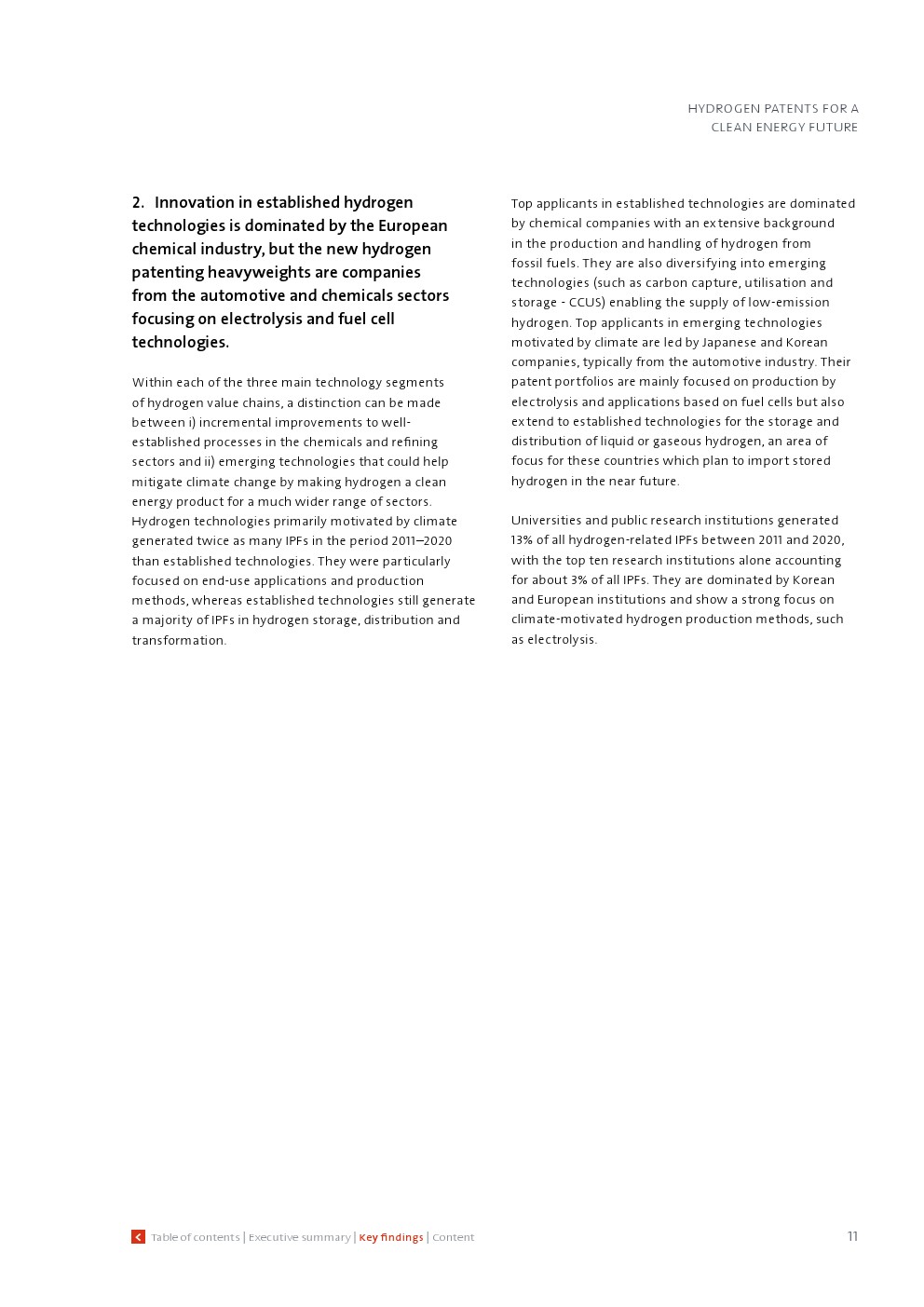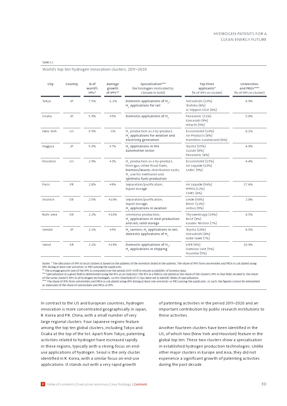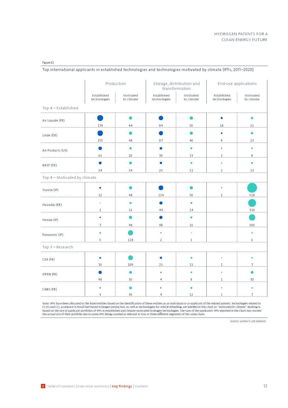大学和公共研究机构在 2011-2020 年产生了所有与氢相关的国际专利的 13.5%,以法国和韩国为首,重点是电解等低排放制氢方法。
