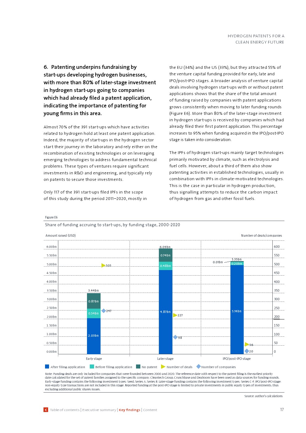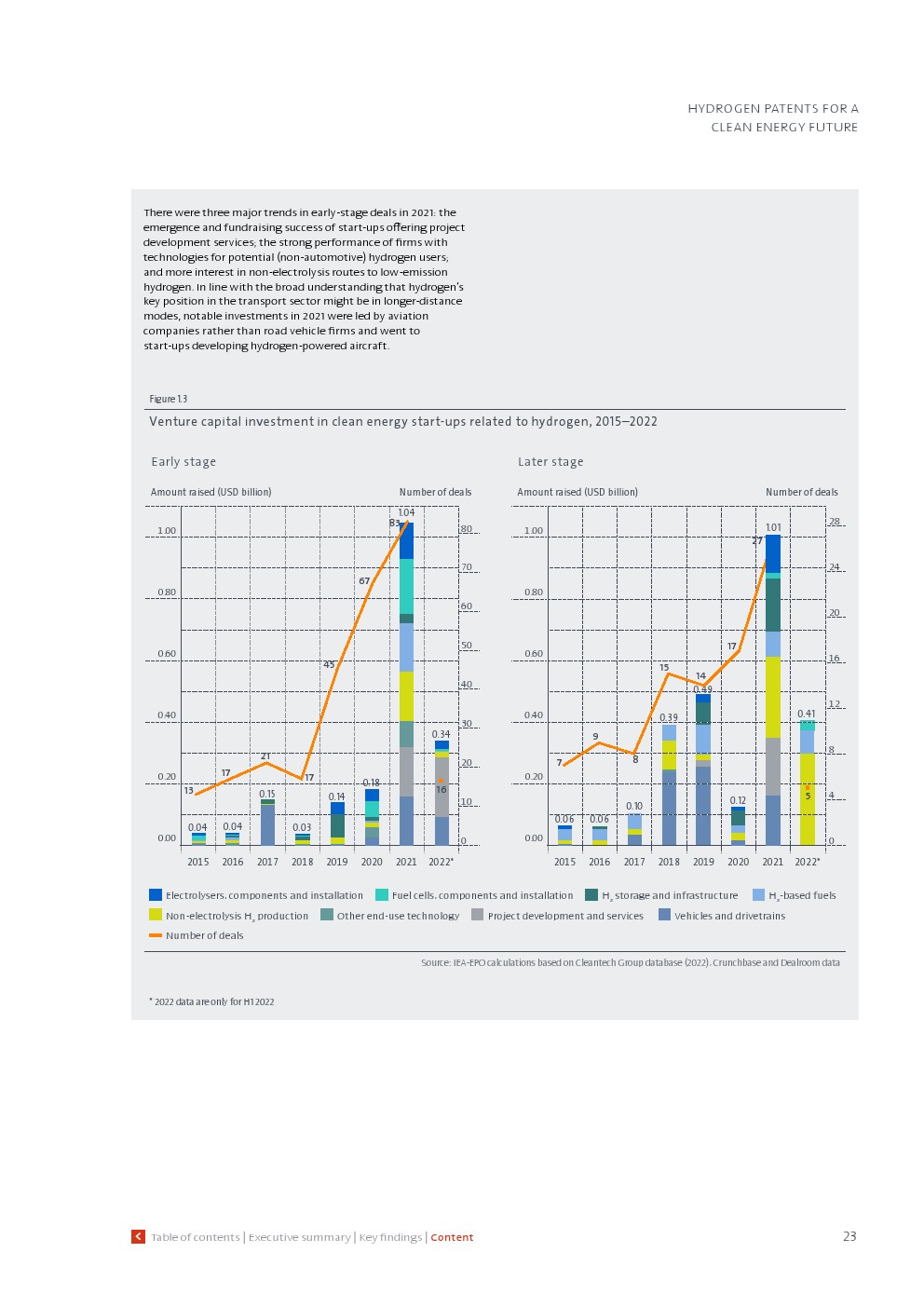 研究发现,2011-2020 年对氢能公司的 100 亿美元风险资本投资中有一半以上流向了拥有专利的初创企业,尽管它们在初创企业中所占比例不到1/3。持有专利是初创企业是否会继续吸引资金的一个很好的指标:2011-2020 年,超过 80% 的氢初创企业后期投资流向了已经在以下领域提交专利申请的公司:电解、燃料电池或从气体中生产氢气的低排放方法。