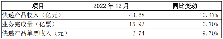 圆通速递表示,自 2021 年底起,公司快递业务中菜鸟裹裹业务的结算模式由原杭州菜鸟供应链管理有限公司与加盟商结算调整为其直接与公司结算;同时,公司承接拼多多等平台的逆向物流业务亦按该等模式结算。2022 年 12 月,上述因素整体影响快递产品单票收入约 0.09 元,剔除该等影响后,公司快递产品单票收入为 2.65 元,同比增长 6.04%。