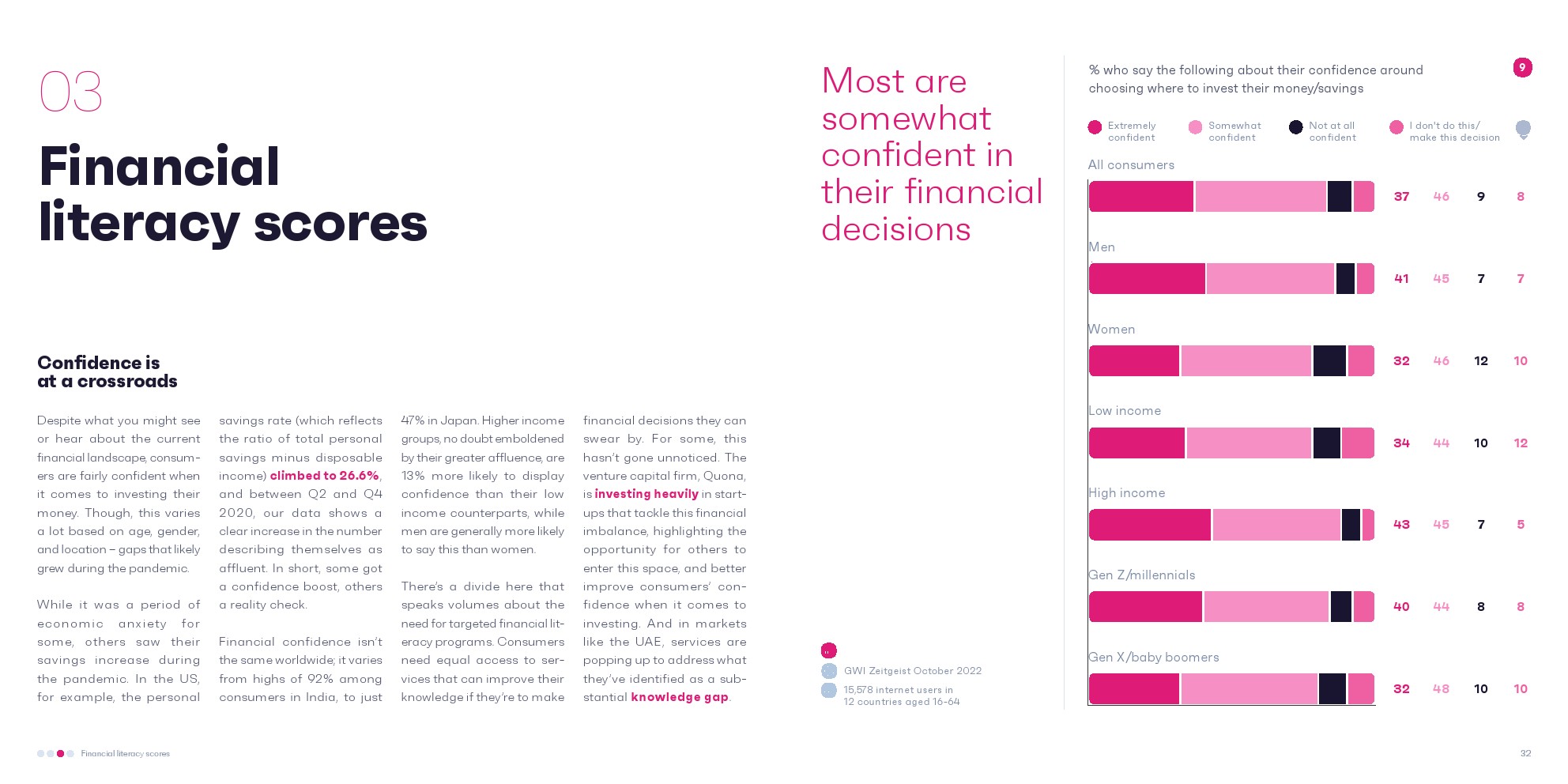 信心在世界各地和不同的人口统计数据中往往会有所不同,但在大多数情况下,消费者在投资时至少有一定的信心。细分数据显示,具有高深金融知识的消费者来之不易。 银行、金融机构和金融科技服务可以介入并解决这个问题。