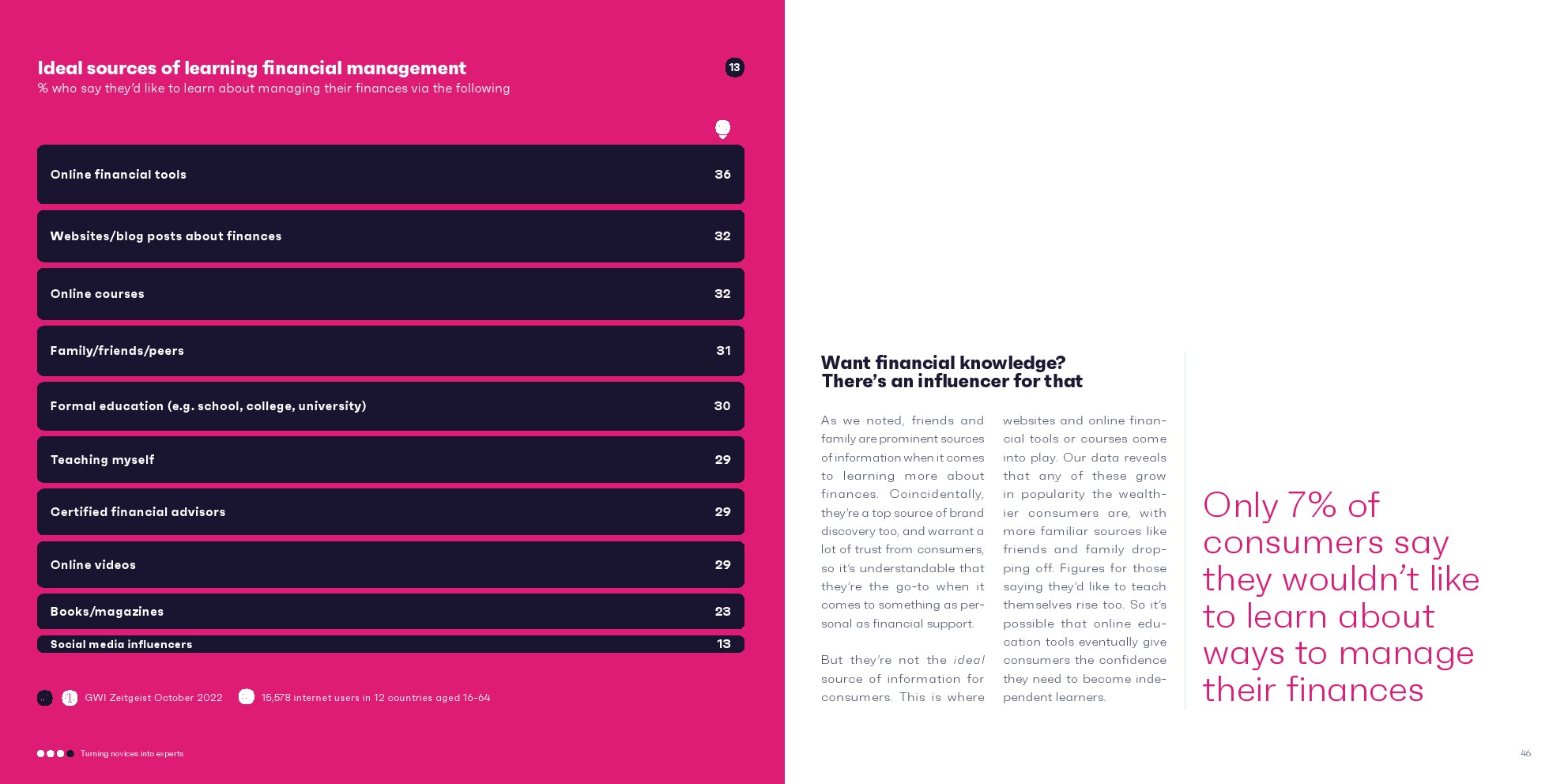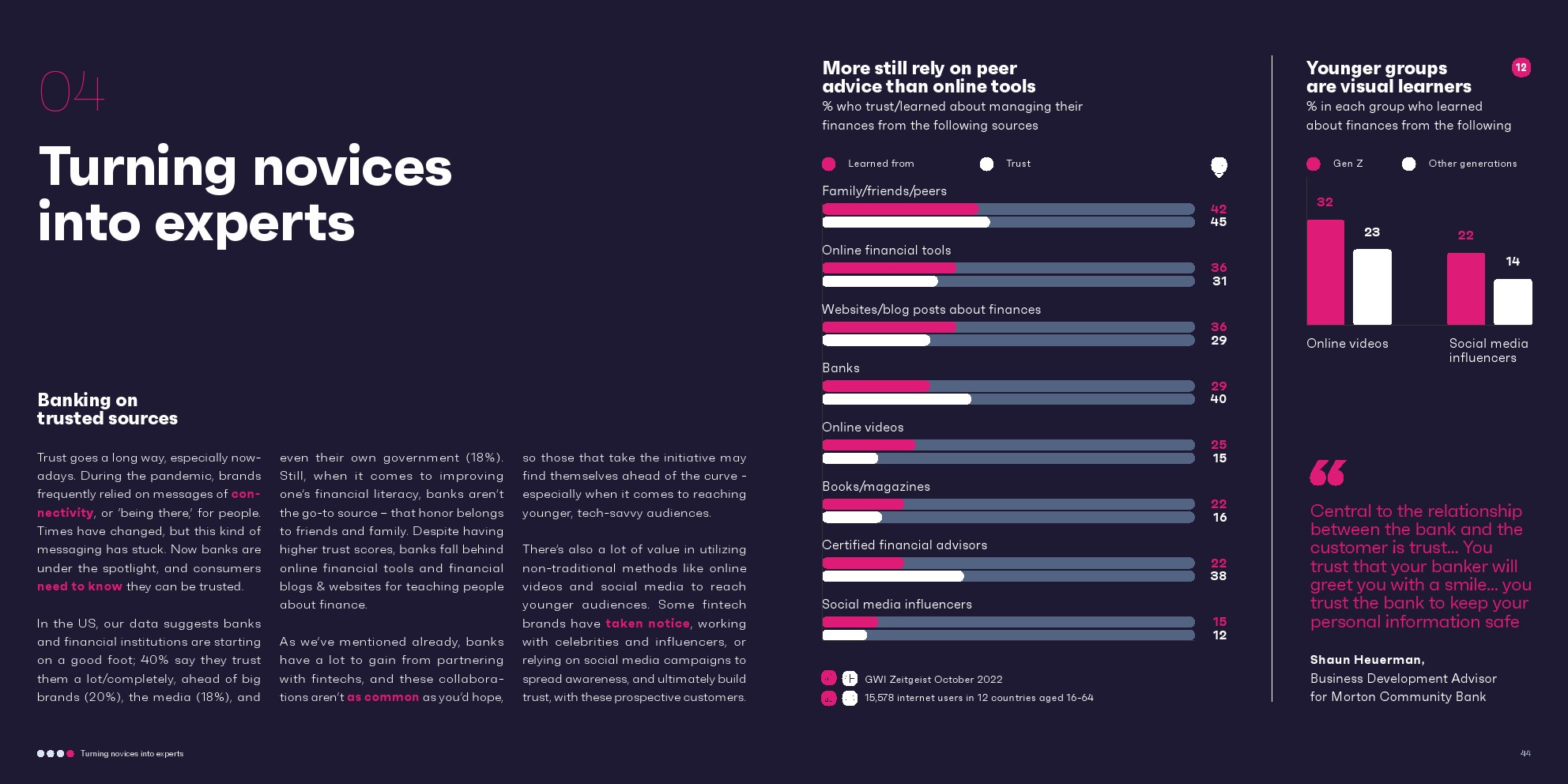 银行和金融机构被认为是相对值得信赖的;40%的受访者非常/完全信任这些机构,远远领先于大品牌(20%)。尽管如此,它们并不是获得金融知识的首选来源;银行在信息来源方面落后于在线金融工具和金融博客/网站。