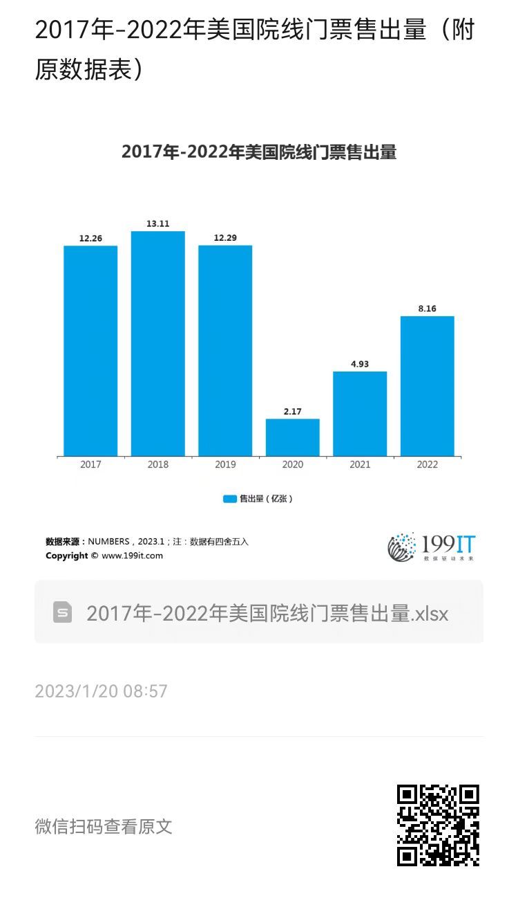 2017年-2022年美国院线门票售出量(附原数据表) ​​​​