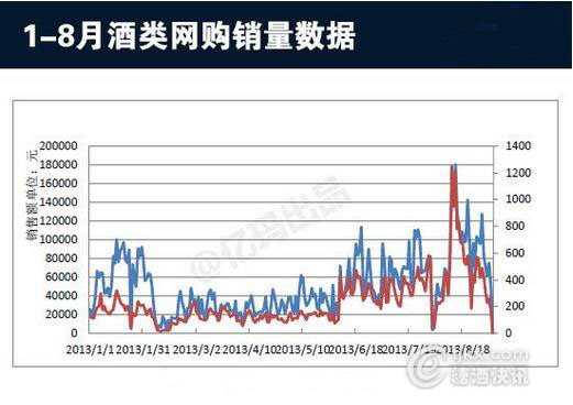 进入2013年8月,酒类产品的第二个网购高峰随之到来,中低端酒品最受市场青睐,网购订单量瞬间冲顶,成为全年的最高峰。