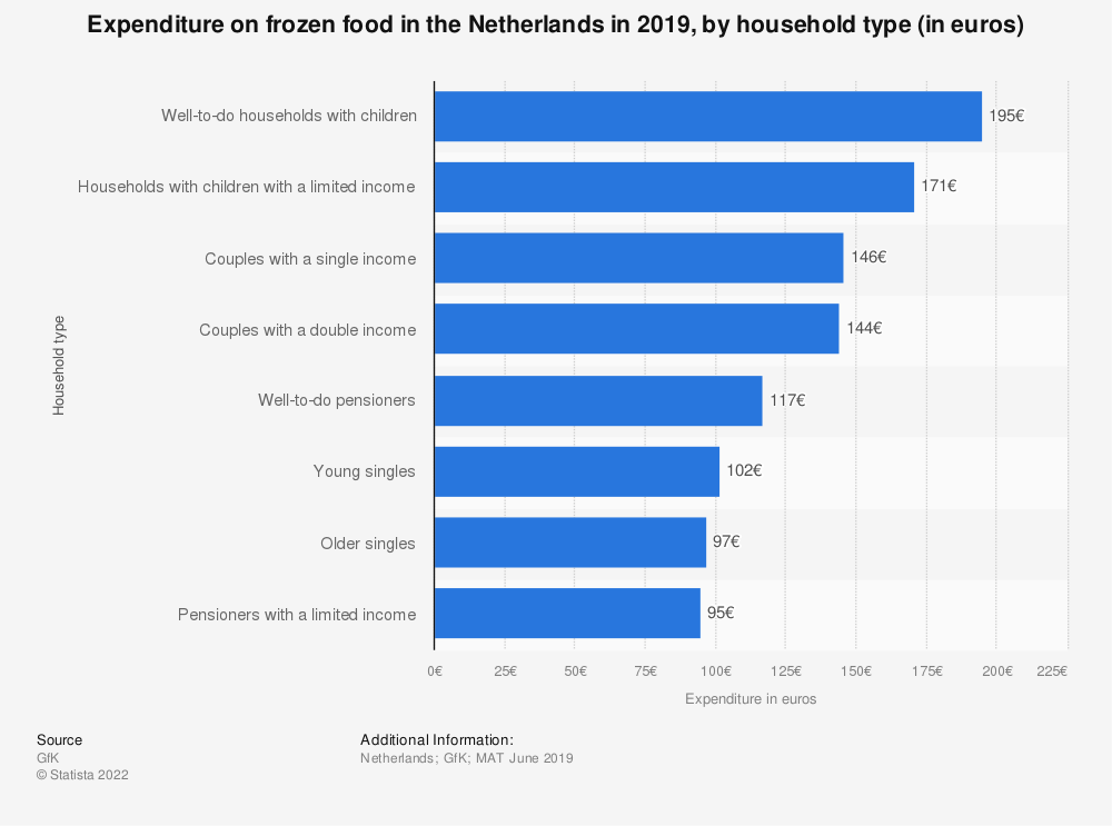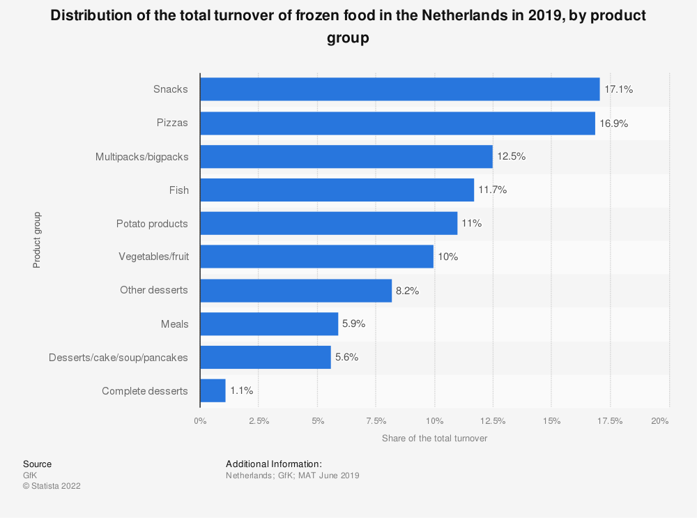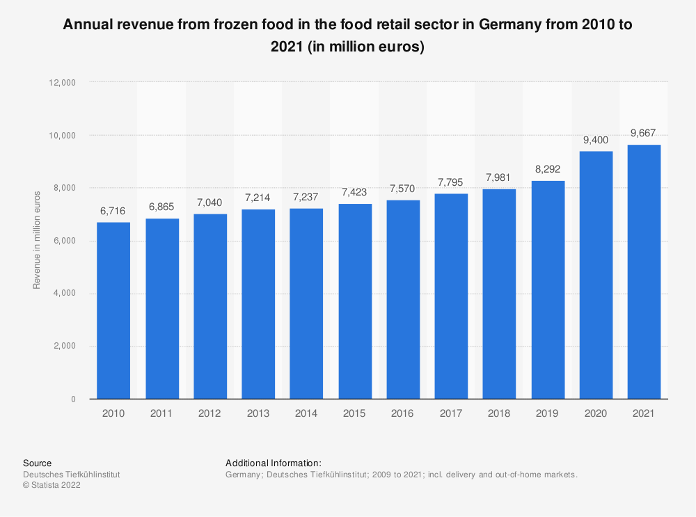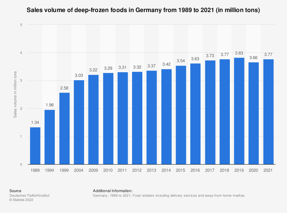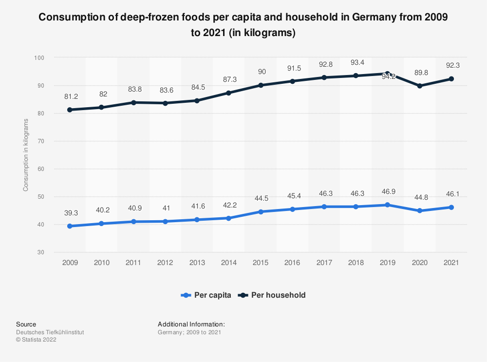 2020年,超过366万吨的冷冻食品在欧洲的主要食品市场德国销售。这里的大部分收入来自于食品零售。2020年,该市场的收入约为94亿欧元。最受欢迎的产品是冷冻鱼(约12.3亿欧元)、披萨(12亿欧元)和肉类(8.2亿欧元)。2020年,德国家庭平均消耗近90公斤深冻食品。从2009年到2020年,冷冻食品的人均消费量从每年39.3公斤增加到44.8公斤,这表明冷冻食品确实越来越受欢迎。