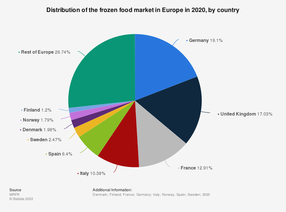 2020年,德国是欧洲最重要的冷冻食品市场,估计市场份额为19%,市值为138亿美元,其次是英国(市场份额17%,市值123亿美元)和法国(13%,市值94亿美元)。